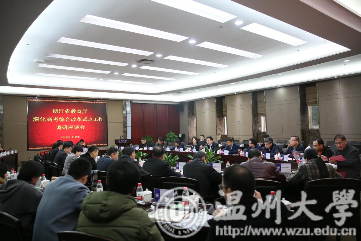 1月10日下午,浙江省深化高考综合改革试点工作调研座谈会在日本a片 举行,会议全面总结我省在深化高考改革试点过程中取得的成效、出现的问题,并向与会专家征求建议和改进措施,进一步完善我省高考综合改革试点工作。副市长郑朝阳、校长赵敏、浙江中、南片区13所高校负责教学或招生工作的校领导、相关部门负责人及教育专家、师生代表共50余人参加会议。省教育厅副厅长于永明主持会议。