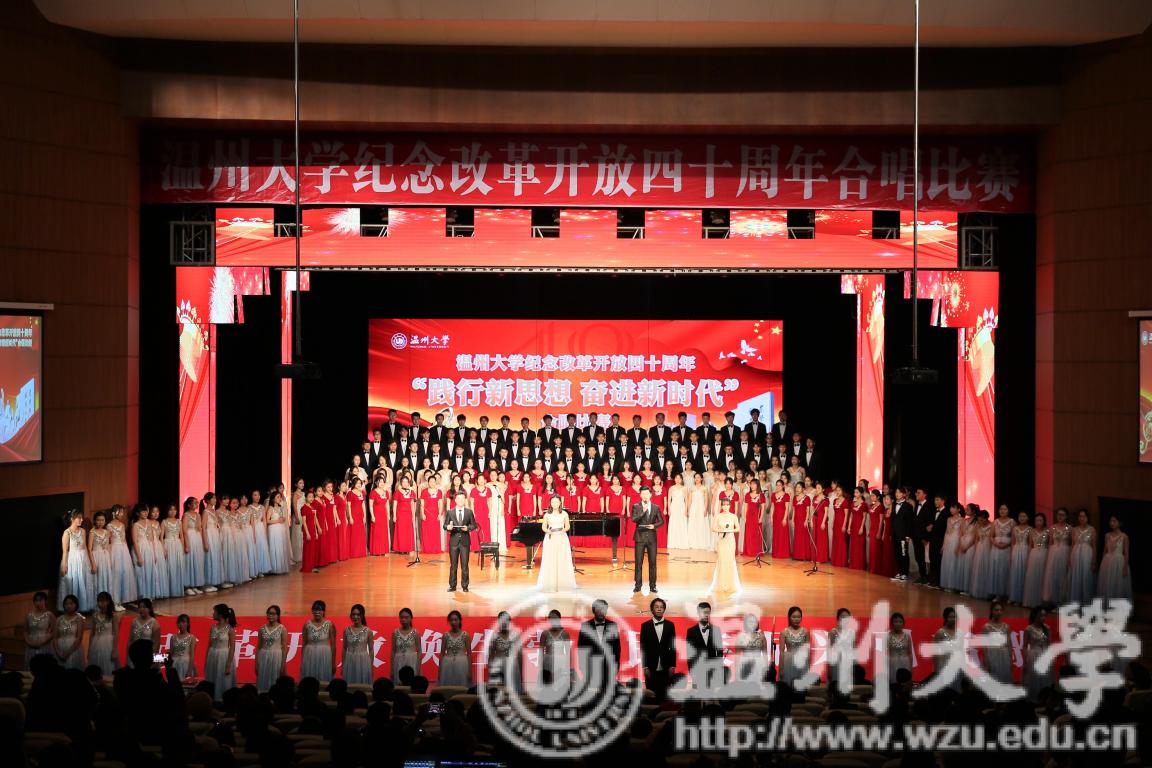 大赛在雄壮的国歌声中拉开序幕,《橄榄树》、《龙船调》、《黄水谣》、《歌唱祖国》、《我的中国心》、《我爱你中国》、《春天的故事》等等一首首脍炙人口的歌曲响彻礼堂各个角落,每个代表队精彩的表演博得观众阵阵热烈掌声。大家怀着对祖国的挚爱,怀着对改革开放的深厚情感,尽情歌颂伟大祖国铸就辉煌的40年,歌颂高等教育跨越腾飞的40年,比赛现场高潮此起彼伏。比赛分为改革之风、春天的故事和不忘初心三个篇章,最后出场的是音乐学院合唱团,他们倾情演唱了《怒吼吧黄河》和《为祖国干杯》,歌声凝聚力量,唱响美丽梦想,恢弘大气,深情豪迈,激荡人心。