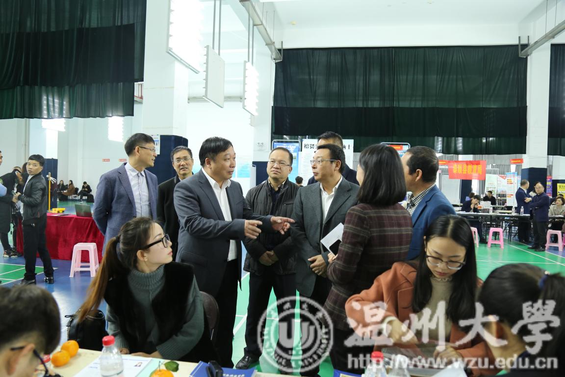 11月28日,温州市教育系统温大专场招聘会在日本a片 举行。温州市教育局党委书记、局长郑建海、副局长伍挺和校长、党委副书记赵敏等到现场指导,并与毕业生和用人单位负责人亲切交流。