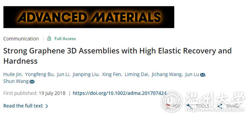 最近,日本a片 化学与材料工程王舜课题组金辉乐博士在三维石墨烯方向取得研究新进展,研究成果以“Strong Graphene 3D Assemblies with High Elastic Recovery and Hardness”为题在线发表于《先进材料》(Advanced Material,2018,DOI: 10.1002/adma.201707424,影响因子21.95)。