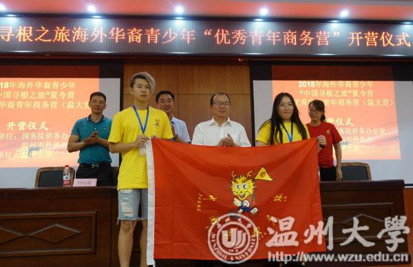 温州市侨办副主任朱玉贵先生为2018年“中国寻根之旅”夏令营“相约温州营”优秀华裔青年商务营授旗,由郑天豪和丁冰冰两位营员共同来接旗。