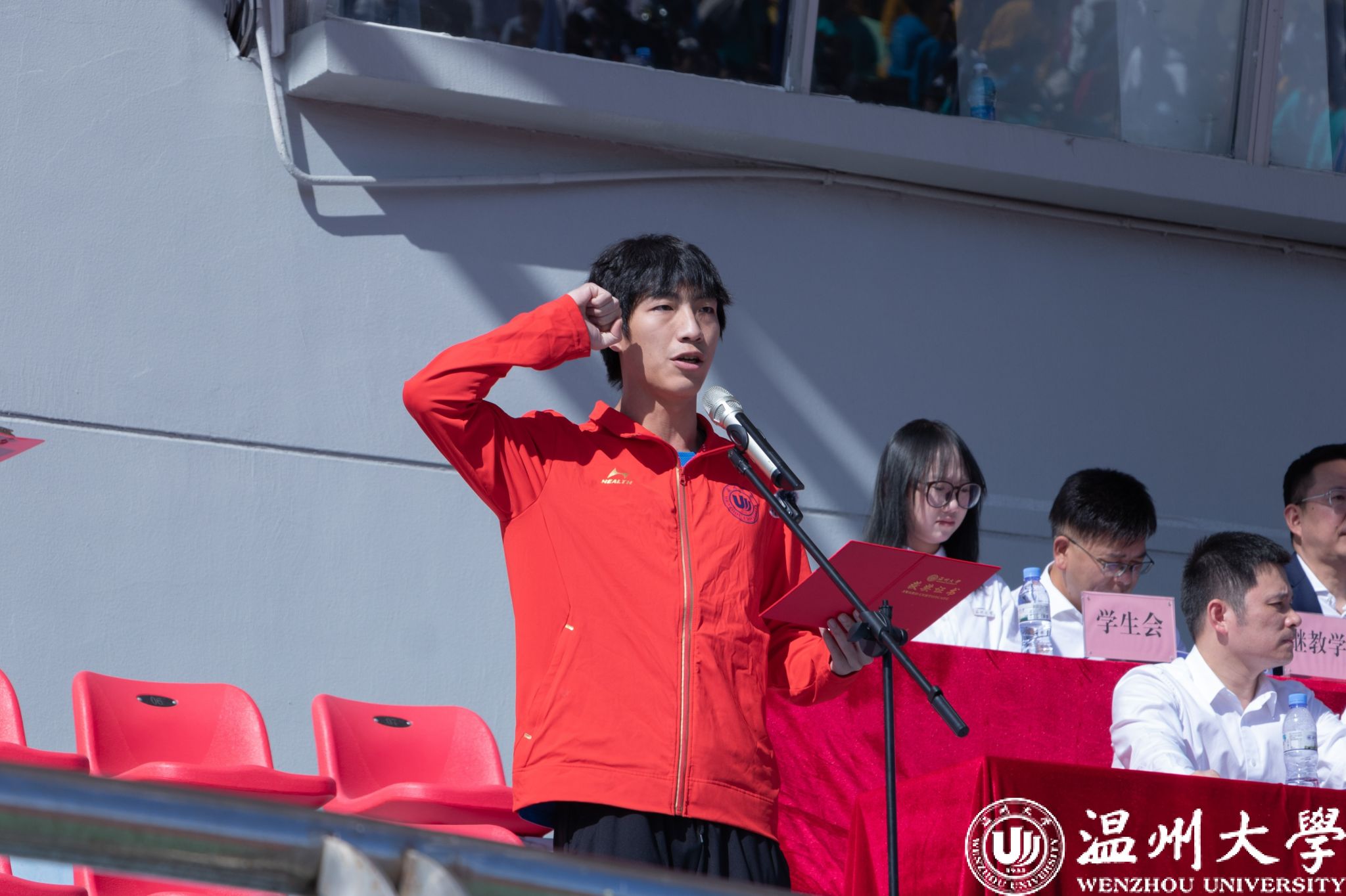田径200米一级运动员李焯晨与田径运动会现场展示裁判长、体操专业教师丁亚帅宣誓,承诺将赛出水平、赛出风格,秉持公正、公平、公开的原则,护航温大体育精神。