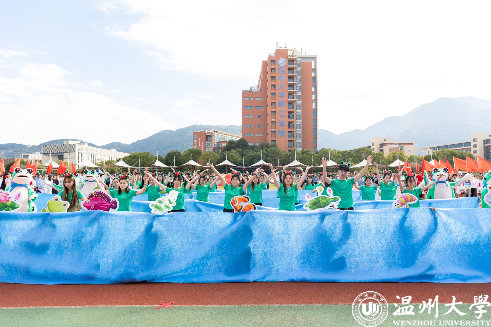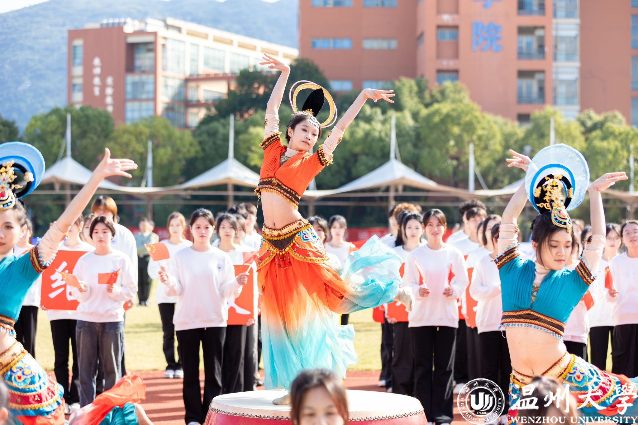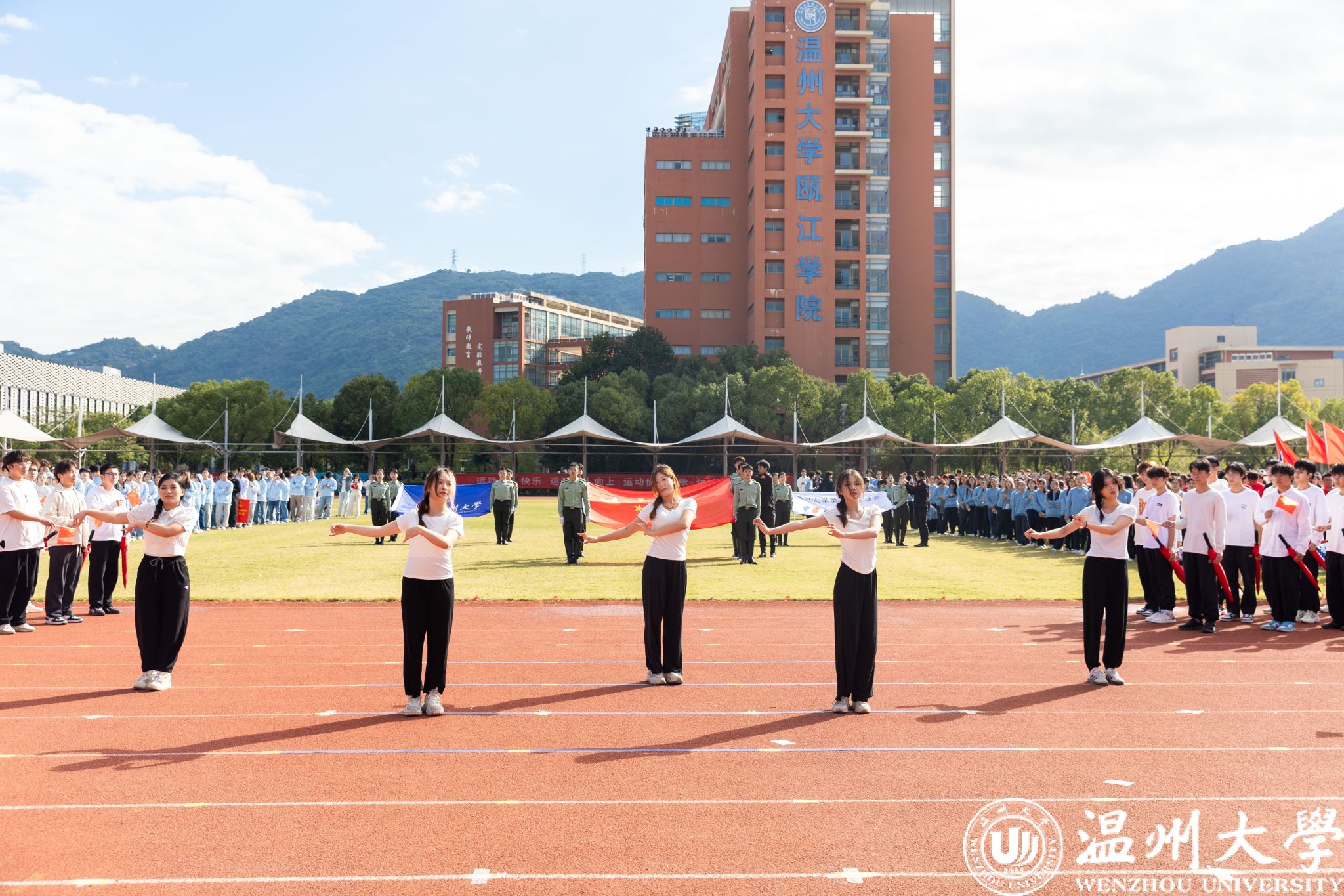温大师生齐唱国歌,五星红旗冉冉升起。旗帜飘扬,激励着每一个人为着更高的荣誉、更远的目标而努力奋斗。
