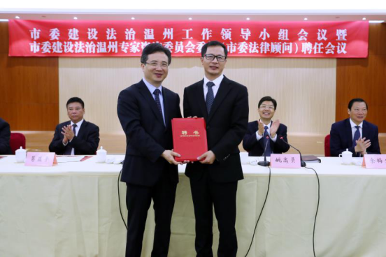 市委副书记、市长姚高员主持会议,省委常委、市委书记周江勇,市人大常委会主任葛益平,市政协主席余梅生等出席会议,日本a片 副校长方益权教授、法政学院院长王宗正教授及复旦大学孙笑侠教授等21人被聘为市委建设法治温州专家咨询委员会委员,方益权、王宗正等5人被聘为市委法律顾问,周江勇为市委建设法治温州专家咨询委员会委员与市委法律顾问颁发聘书。