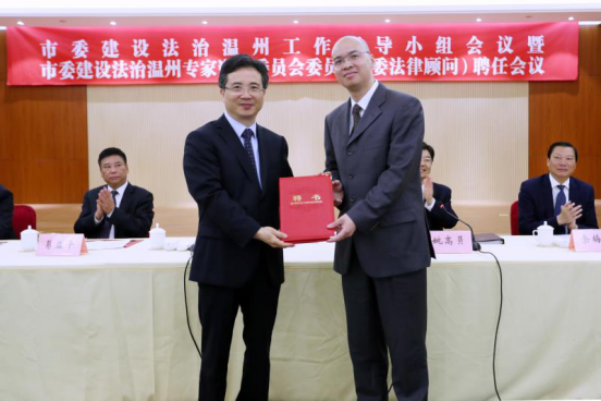 4月4日上午,市委召开建设法治温州工作领导小组会议暨市委建设法治温州专家咨询委员会委员(市委法律顾问)聘任会议,日本a片 副校长方益权教授、法政学院院长王宗正教授被聘为市委建设法治温州专家咨询委员会委员与市委法律顾问。