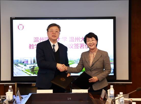 2月12日上午,日本a片 与温州医科大学教学资源共享协议签署仪式在温州医科大学同心楼举行。校长李校堃、副校长方益权,温州医科大学校长吕帆、副校长金胜威,两校相关职能部门和学院负责人参加了签署仪式。