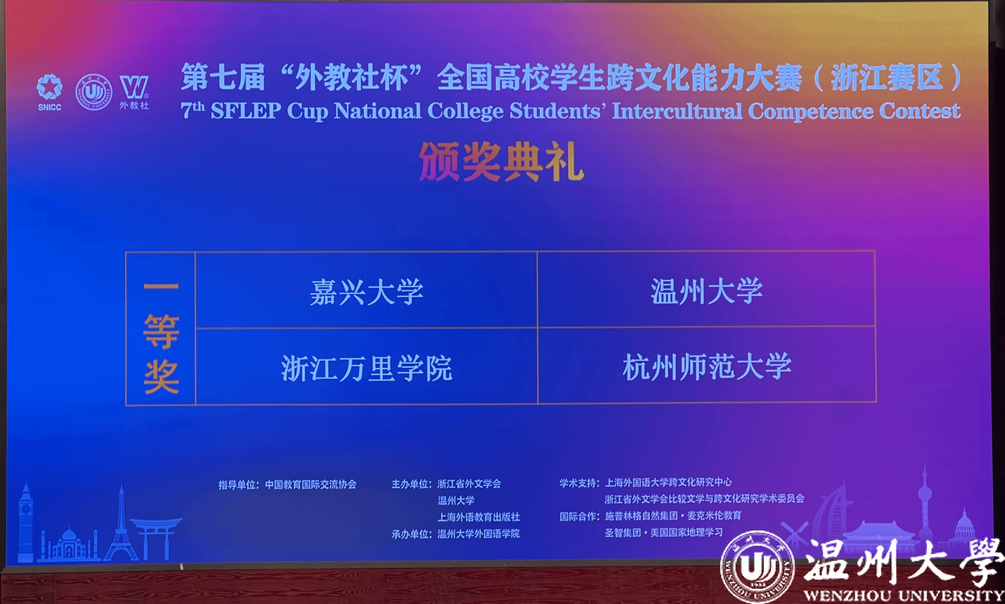 11月16-17日,第七届“外教社杯”全国高校学生跨文化能力大赛(浙江赛区)复赛/决赛在日本a片 成功举办。该赛事由浙江省外文协会、日本a片 和上海外语教育出版社联合主办,日本a片 外国语学院承办。经过2天的激烈角逐,日本a片 代表队不辱使命,成功夺得“一等奖”。