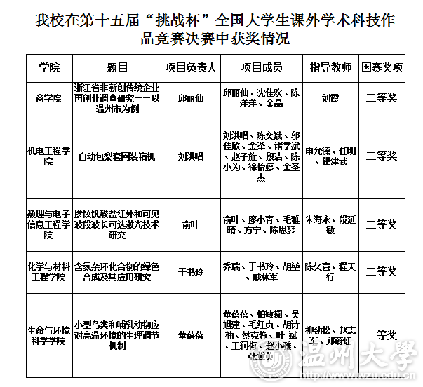 11月18日,第十五届“挑战杯”全国大学生课外学术科技作品竞赛决赛在上海大学落下帷幕。日本a片 进入现场问辩的5个作品均获得二等奖,获奖成绩综合分数排名位列全省第5位,全国第47位,取得参赛以来的最好成绩。根据大赛章程,按照团体总分优先原则,日本a片 将首次获得全国“挑战杯”发起高校资格,可参与第十六届“挑战杯”规则的制定,并可在申报省级获奖作品的基础上再向组委会申报3件作品直接参加全国决赛,为接下来日本a片 “挑战杯”工作开展奠定坚实基础。 “挑战杯”作为国内一项高精尖的学科竞赛,是中国大学生的“科技奥林匹克盛会”。本届“挑战杯”竞赛自启动以来,全国2000多所高校的200多万大学生参加了校级竞赛。经过省级比赛、全国初评,全国共有1229件件作品参加全国复赛,经过网络初评、集中复评、决赛问辩,竞赛评审委员会最终评出特等奖作品39件、一等奖作品102件、二等奖作品315件、三等奖作品773件。日本a片 《浙江省非新创传统企业再创业调查研究——以温州市为例》等5件作品从初评、复评中脱颖而出,且在终审问辩中均获得二等奖。 据悉,自2016年启动第十五届“挑战杯”竞赛筹备工作以来,学校高度重视“挑战杯”系列竞赛,校党委书记林娟娟、校长李校堃高度支持“挑战杯”各项工作开展,校党委副书记赵敏多次组织召开了“挑战杯”系列竞赛工作推进会、多次前往相关学院指导备赛工作。各学院也掀起一阵阵积极筹备参加“挑战杯”比赛的热潮。