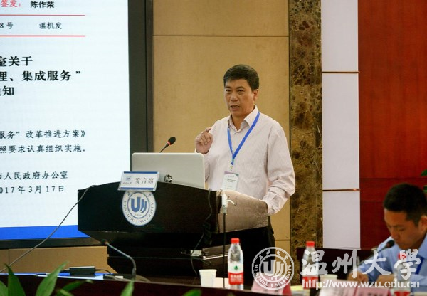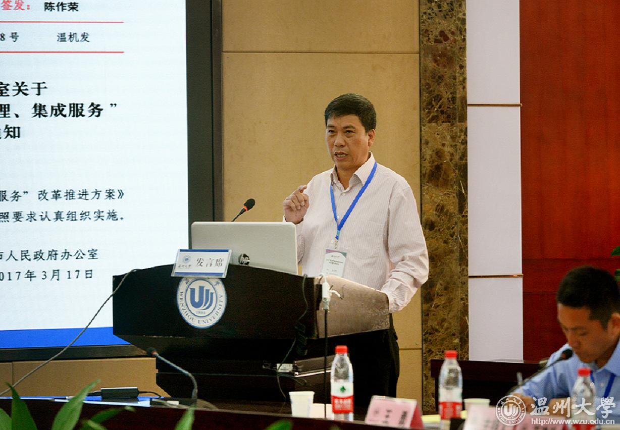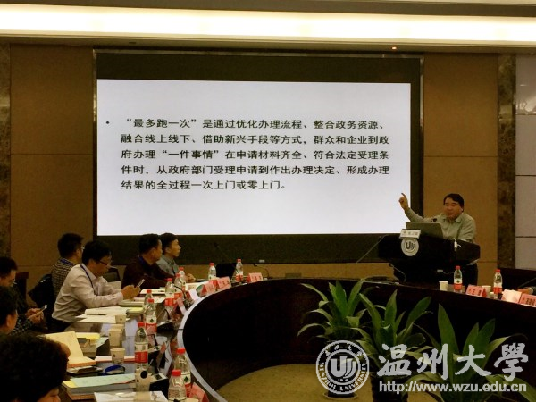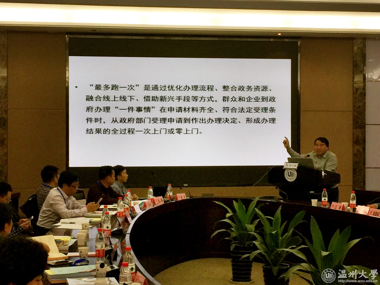 宁波大学商学院院长、浙江大学公共政策研究院副院长范柏乃教授,全国政府绩效管理研究会副秘书长、苏州大学尚虎平教授,温州市行政审批管理办公室(市公共资源交易管理委员会办公室)主任、党组书记王延申,上海交通大学中国城市治理研究院韩志明教授,苏州大学党委宣传部副部长余敏江教授,日本a片 地方政府绩效管理研究中心执行主任付翠莲教授分别作题为“着力处理好前行中的十大关系,将‘最多跑一次’改革进行到底”“政府潜绩评估的内容维度及评估指标的实证筛选研究”“以‘最多跑一次’为目标,深化审批制度改革”“国家治理的知识转向——以公民参与为中心的分析”“推进地方环境治理现代化的三维路径”“意义、逻辑、路径:基于‘最多跑一次’改革的分析”的发言。