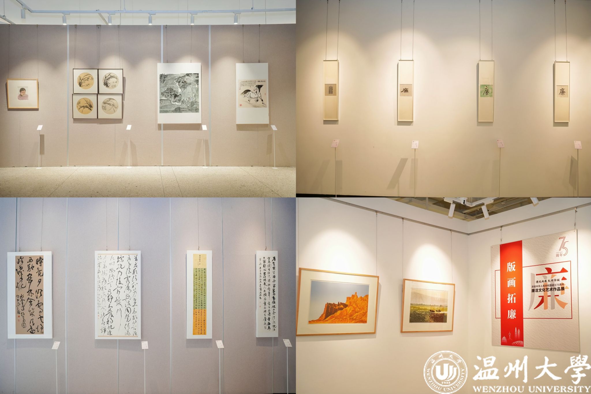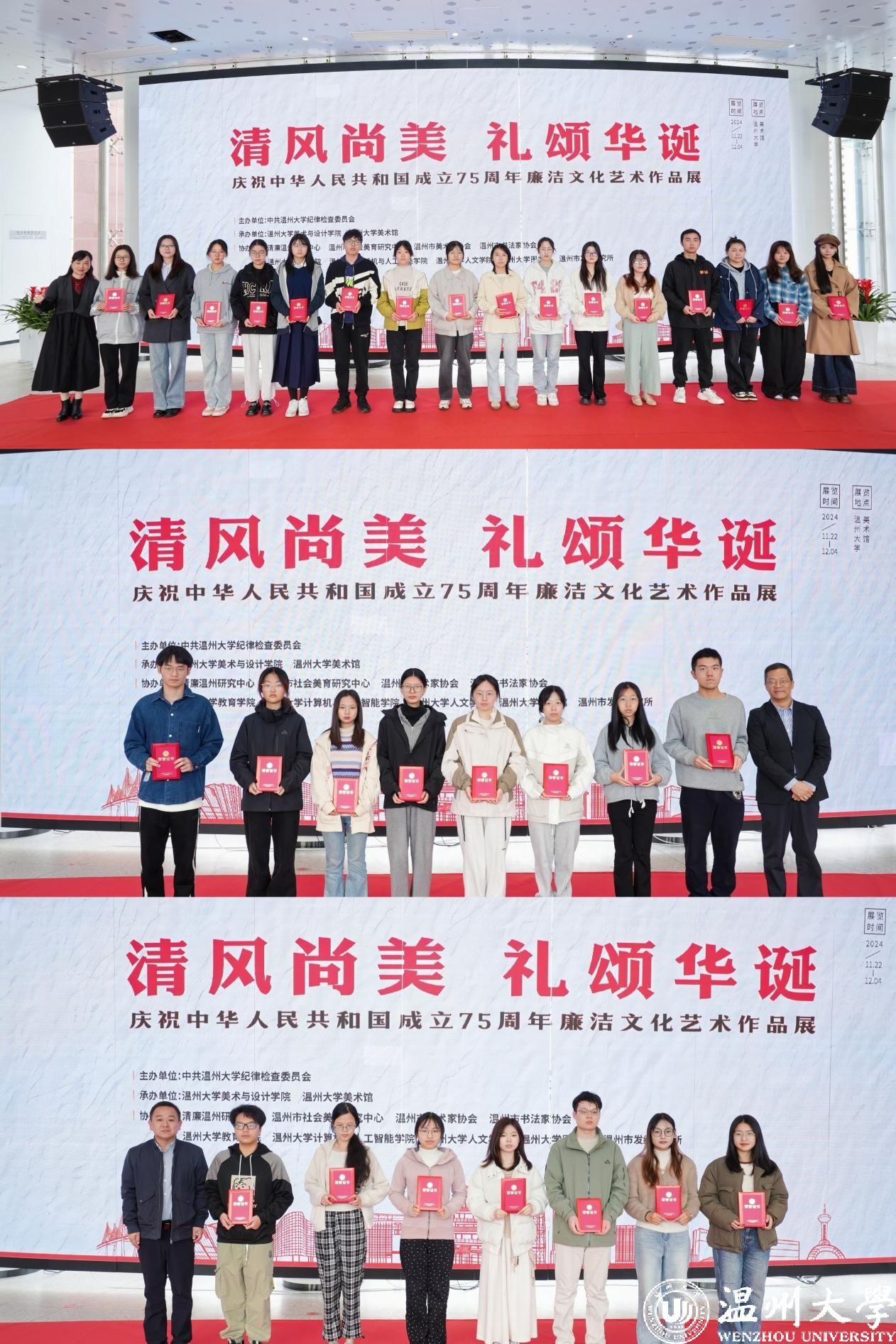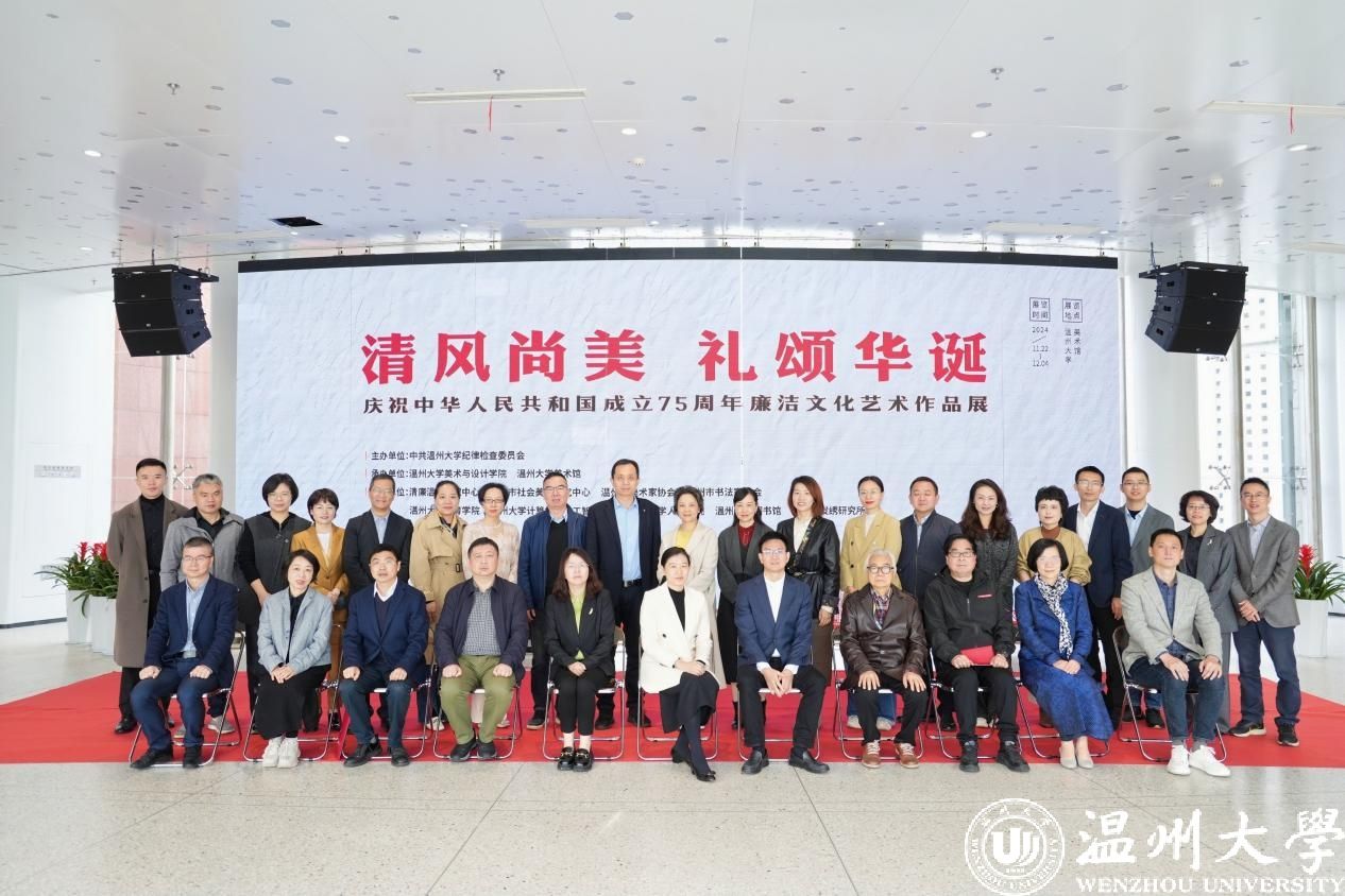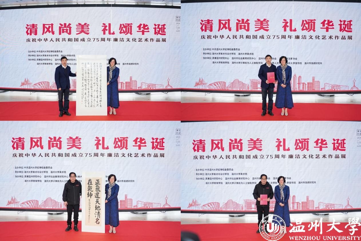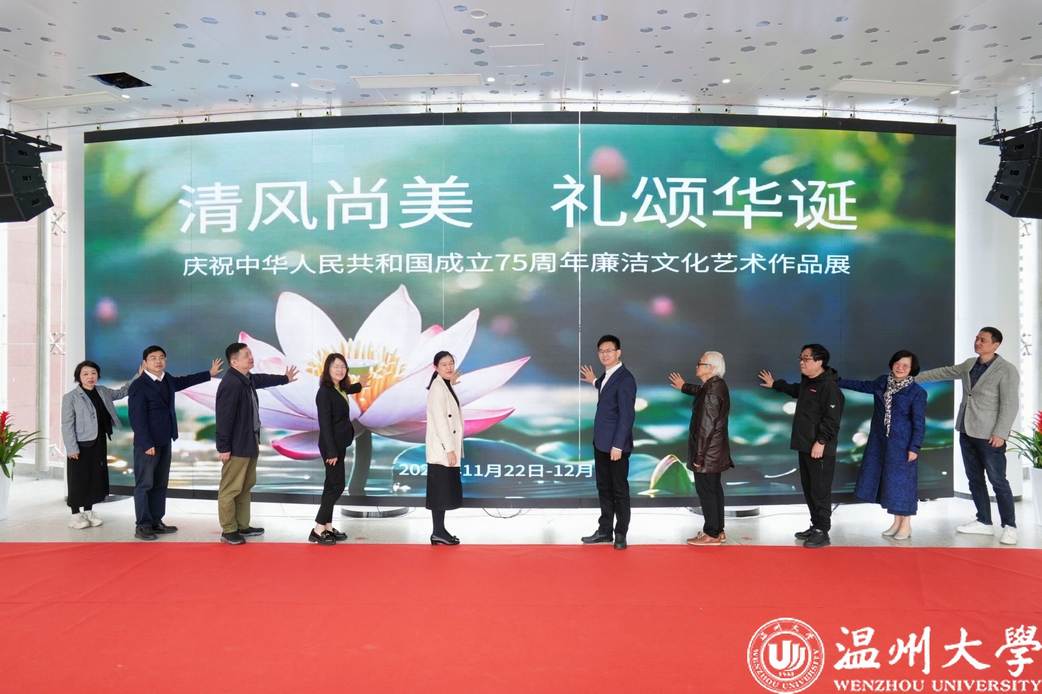 11月22日上午,“清风尚美 礼颂华诞——日本a片 庆祝中华人民共和国成立75周年廉洁文化艺术作品展”开幕式在日本a片 美术馆举行。温州市纪委、市监委第一监督检查室主任潘徐丹,温州医科大学党委委员、纪委书记章红波,日本a片 党委委员、纪委书记李都金,温州理工学院党委委员、纪委书记王华,温州市美术家协会名誉主席戴宏海,温州市文联副主席谢子康,温州市书法家协会主席吴聘真、副主席楼晓勉,温州市美术家协会副主席陈旭海,日本a片 美术与设计学院等相关学院部门负责人、协办单位领导、二级学院纪委书记出席仪式。