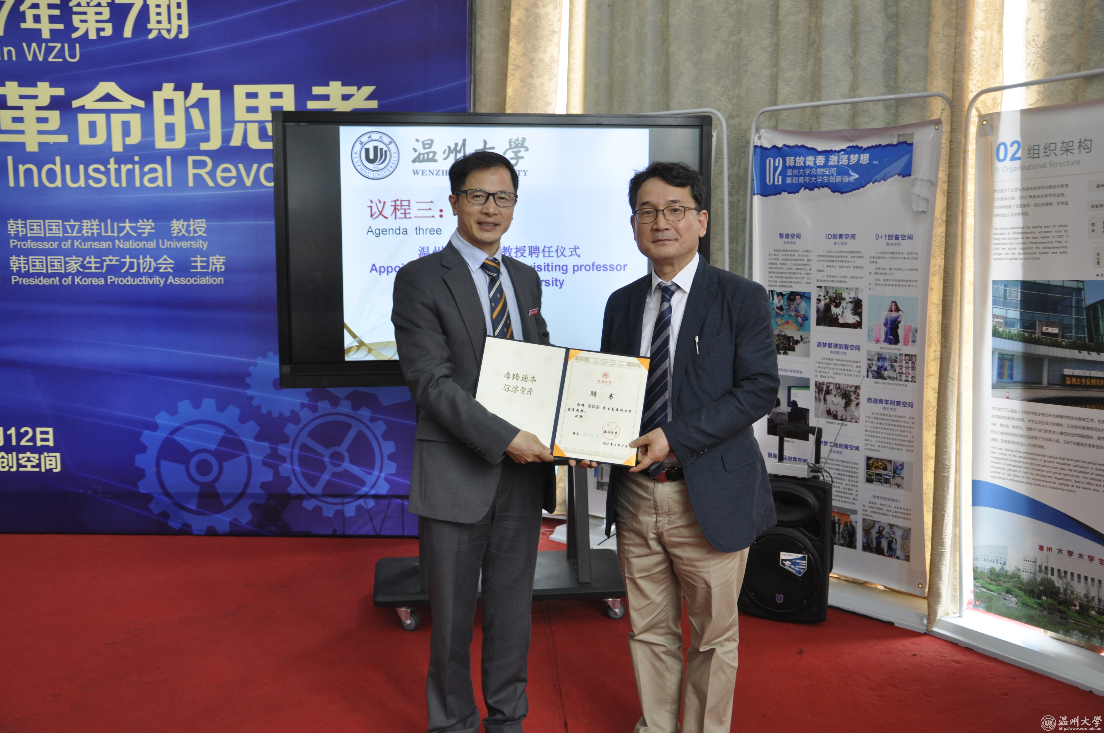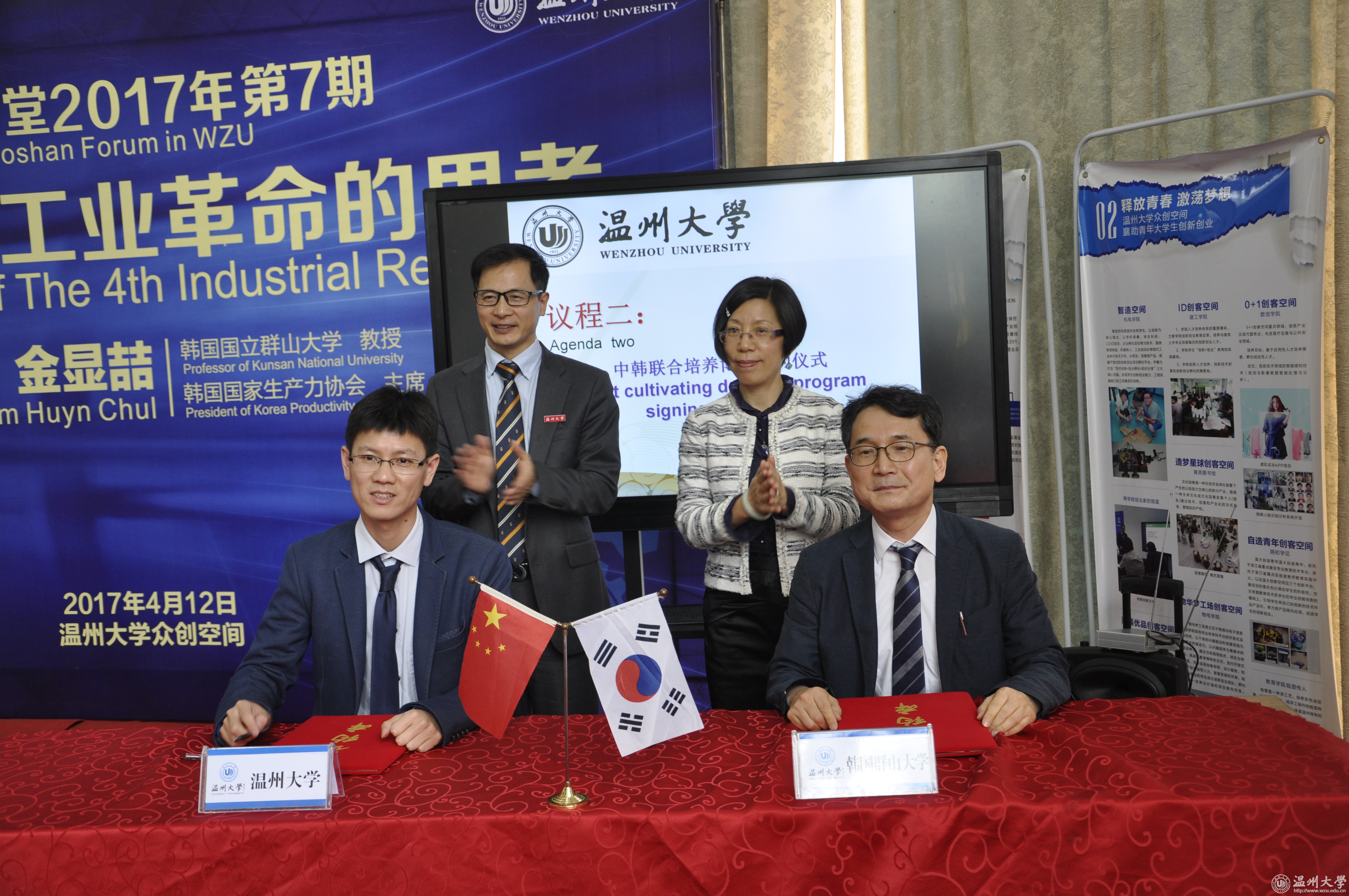 4月12日,韩国国家生产力协会主席、韩国国立群山大学金显喆教授做客罗山讲堂,给师生带来一场名为“关于第四次工业革命的思考”的主题演讲。副校长方益权,有关单位负责人,创业人才培养学院全体工作人员,企业家代表、留学生代表、创业学生代表共计一百余人聆听演讲。 创业人才培养学院负责人与金显喆共同签署中韩联合培养创业博士协议;方益权为金显喆颁发聘任证书。