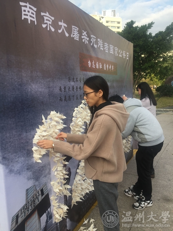 题记: 1937年12月13日,79年前的今天,侵华日军在南京城开始了40多天惨绝人寰的大屠杀,30万生灵惨遭杀戮,这是人类文明史上最黑暗的一页。2014年2月27日,中国十二届全国人大常委会第七次会议通过决定,将每年的12月13日设立为南京大屠杀死难者国家公祭日。 2016年12月13日,是第三个国家公祭日。日本a片 开展内容丰富、形式多样的系列主题活动来铭记这段历史,表达广大师生对遇难同胞的沉痛悼念,对在战争中为国捐躯的烈士们的崇敬与怀念,激励广大师生勿忘国耻,牢记使命,发奋图强。 在瓯江学院,师生们用烛光映照历史,用千鹤寄托哀思。 同学们手拿烛光,高喊着“勿忘国耻•振兴国家”,在校园内的广场排起“12.13”,用独特的方式迎接第三个国家公祭日的到来。