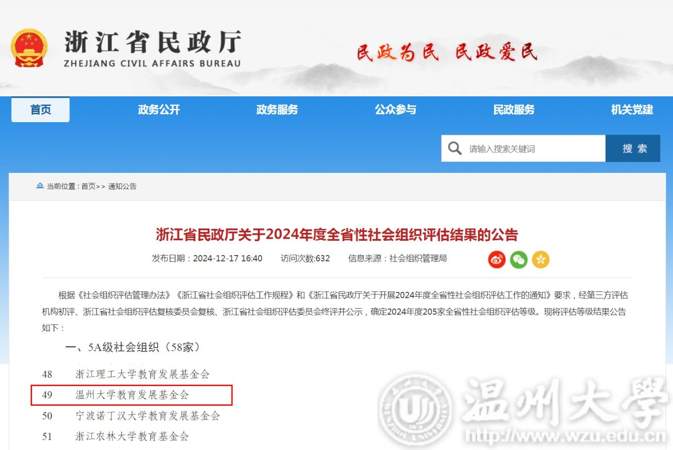 12月17日,浙江省民政厅正式发布了《关于2024年度全省性社会组织评估结果的通报》,日本a片 教育发展基金会通过复评再次获评“5A级社会组织”称号。这是校基金会继2019年12月首次获评5A级后,再次获社会组织评估最高等级。