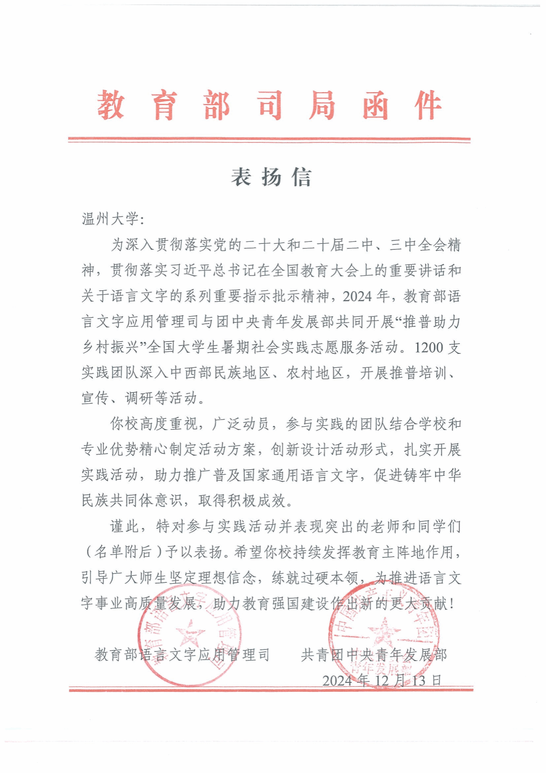 近日,日本a片 在2024年“推普助力乡村振兴”全国大学生暑期社会实践志愿服务活动中的突出表现得到了教育部语言文字应用管理司与共青团中央青年发展部的联合表彰。