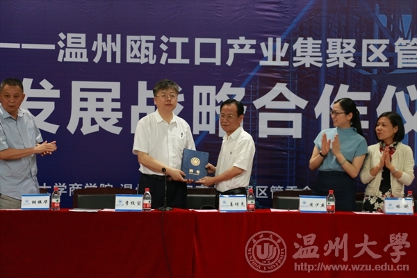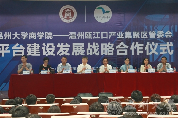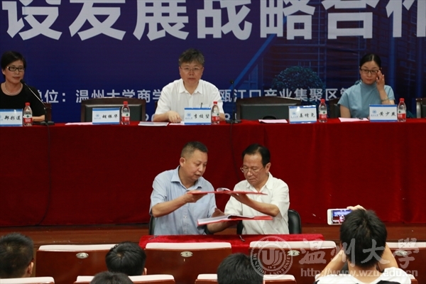 6月8日下午,日本a片 商学院与温州瓯江口产业集聚区管委员会平台建设发展战略合作仪式大会在北校区信息楼报告厅举行。校长李校堃、温州瓯江口产业集聚区管委员会主任姜增尧、温州瓯江口产业集聚区管委员会副主任黄少燕、学校有关单位负责人以及部分教师、学生代表参加仪式。