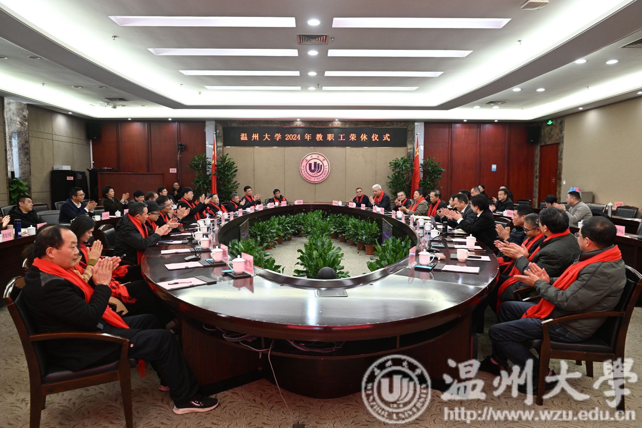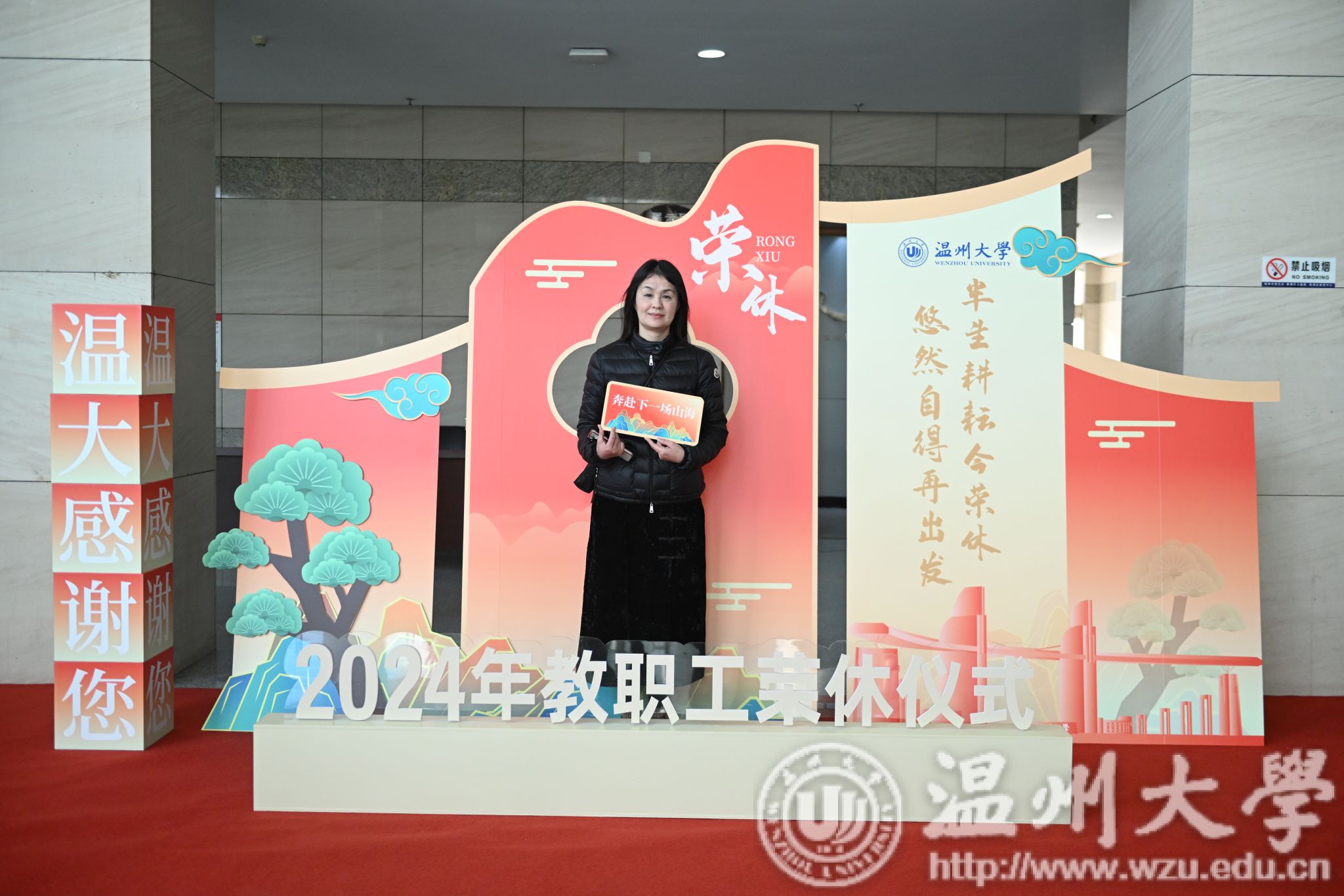 荣休仪式后,全体与会人员集体合影。荣休教职工纷纷来到“‘温大感谢您’——半生耕耘今荣休 悠然自得再出发”打卡点拍照留念,定格下这一难忘的时刻。
