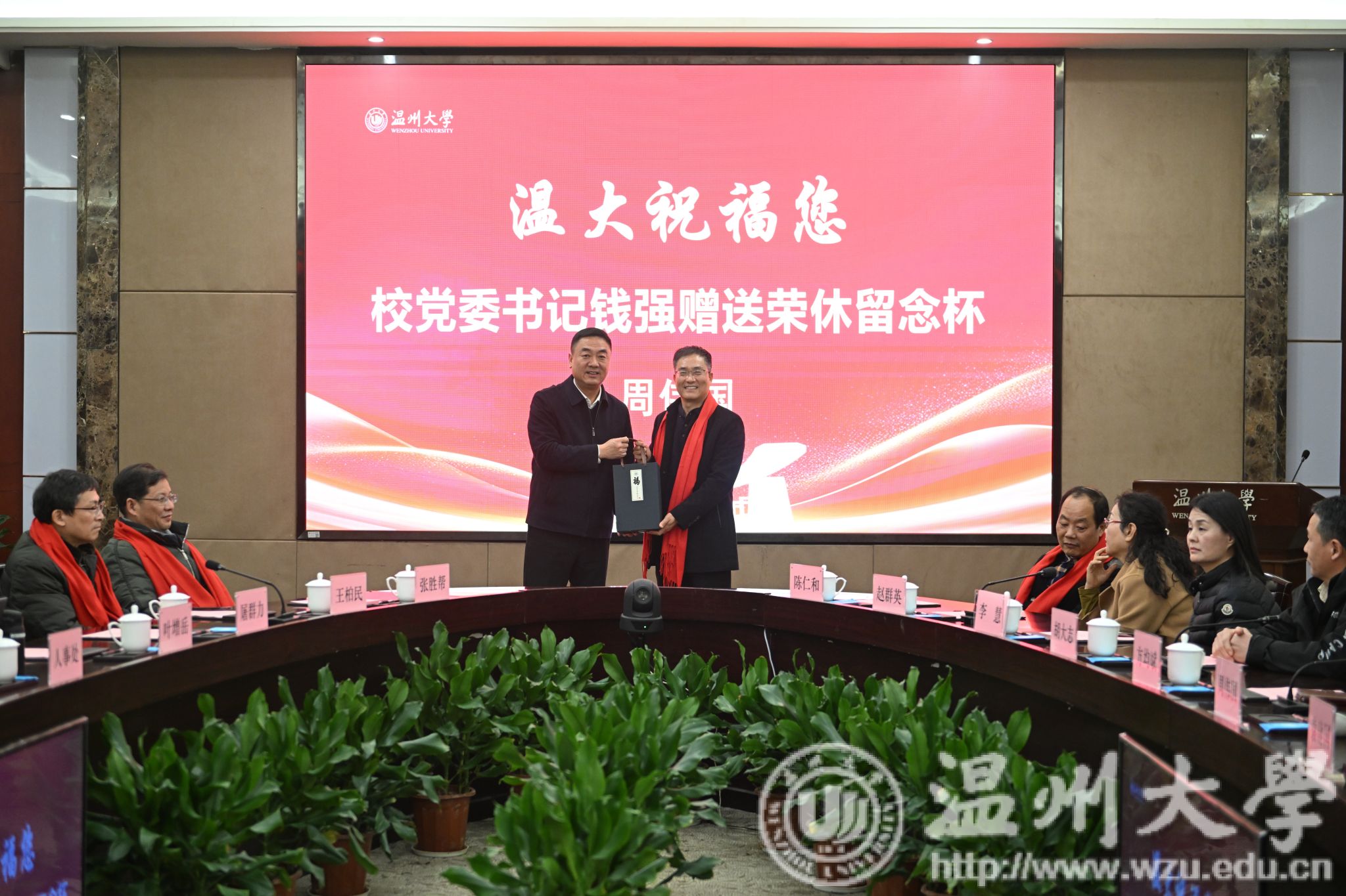 荣休仪式上,钱强亲自为荣休教职工围戴红色围巾、颁发镌刻“岁月鉴初心 荣休敬韶华”和姓名的对杯纪念品。不仅表达了对荣休教职工的崇高敬意,也寄托了对他们未来生活的美好祝愿。