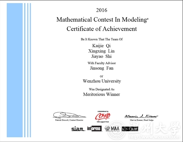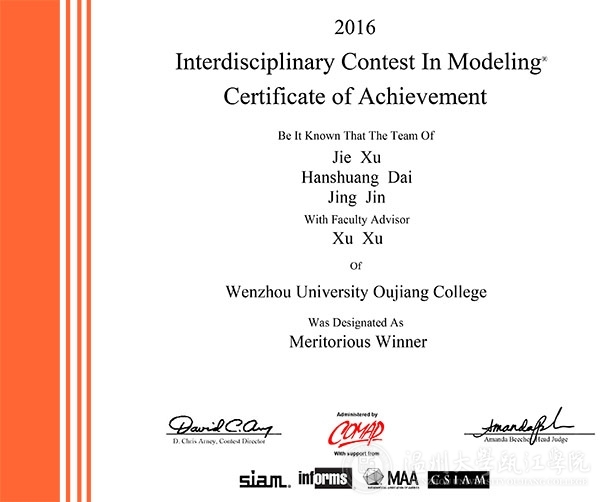日前,2016年美国大学生数学建模竞赛(MCM/ICM)成绩公布,日本a片 瓯江学院、数学与信息科学学院的学子与来自哈佛大学等世界一流大学的学生同台竞技,最终获得一等奖3项,二等奖3项的佳绩,其中,瓯江学院的成绩位列浙江省22所参赛独立学院之首。 2016年美国大学生数学建模竞赛(MCM/ICM)于北京时间2016年1月29日(农历月腊月二十)9点至2月2日9点在全球通过网络同步举行,来自中国、德国、美国、英国、加拿大、新加坡等国家超过10000支大学生队伍参加了竞赛,其中包括来自哈佛大学、普林斯顿大学、麻省理工学院、清华大学、北京大学等国际知名高校学生参与此项赛事角逐。竞赛以三名本科生为一组,在四天时间内,就指定的问题完成从建立数学模型、求解、验证到论文撰写,以清楚的格式、流畅的英文提交一篇20页左右的论文到竞赛组委会。 据悉,美国大学生数学建模竞赛是唯一的国际性数学建模竞赛,也是世界范围内最具影响力的数学建模竞赛,为现今各类数学建模竞赛之鼻祖。该项竞赛始于1985年,由美国数学及其应用联合会(comap)主办,美国数学学会、运筹学学会、工业与应用数学学会等多家机构协办。目前该项赛事已经成为最著名的国际大学生竞赛之一,每年包括哈佛大学、麻省理工学院、北京大学、清华大学等国内外顶级高校的学生都会参加各奖项的角逐。赛题内容涉及经济、管理、环境、资源、生态、医学、安全、未来科技等众多领域,着重强调研究问题、解决方案的原创性、团队合作、交流以及结果的合理性,具有极强的实际应用背景。