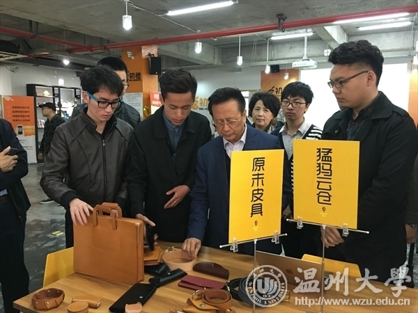 考察过程中,来自日本a片 商学院14级学生马谦诚的“猛犸跨境云仓项目”和美术与设计学院13级学生郭笃鹏的“原未皮具项目”引起了陈昌智的浓厚兴趣。两位项目负责人分别就业务范围、技术支撑、服务对象以及推广前景等进行了详细介绍。