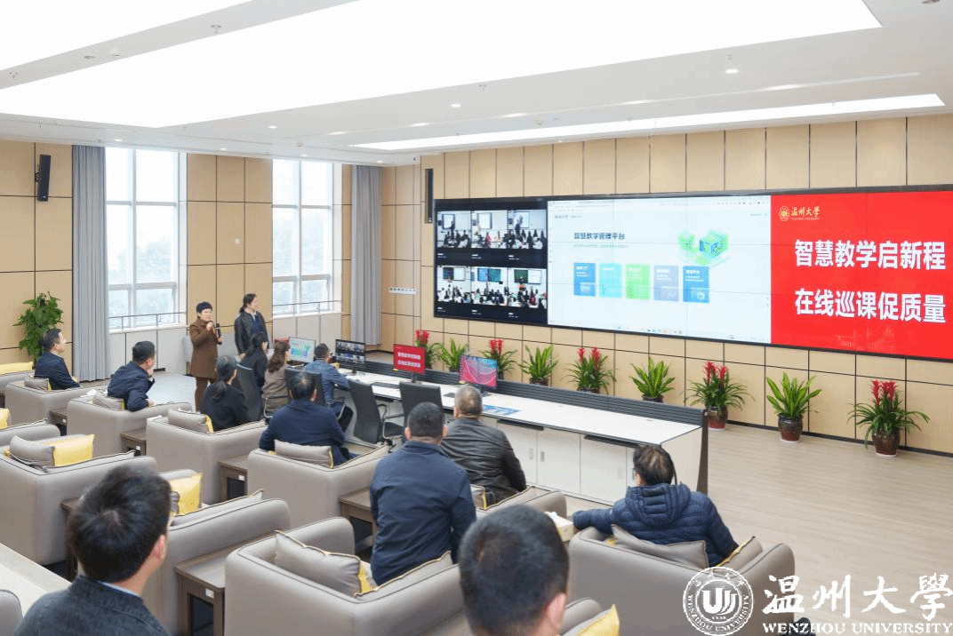 检查组一行首先抵达学校智慧校园展示中心,通过大屏幕进行线上巡课,实时巡查学校教学情况。教师教学发展中心和信息中心负责人分别介绍了学校教育教学质量管理体系和学校在线巡课系统。
