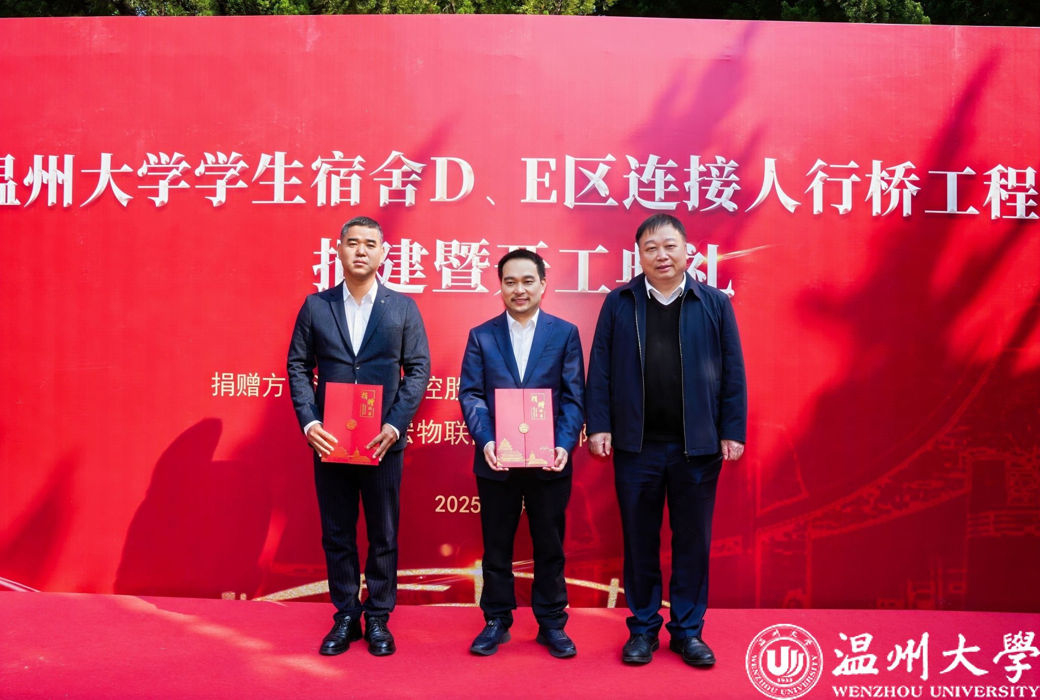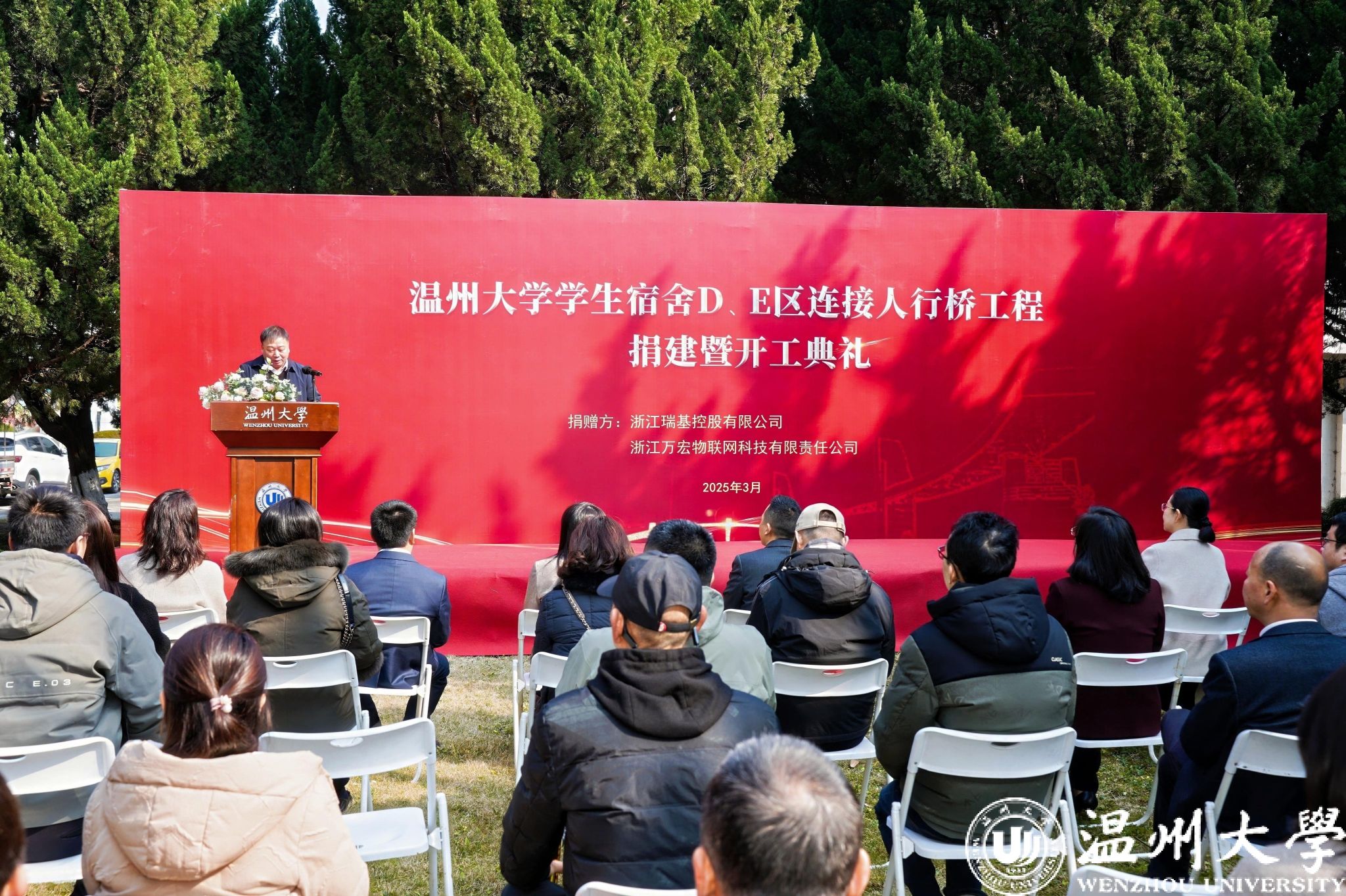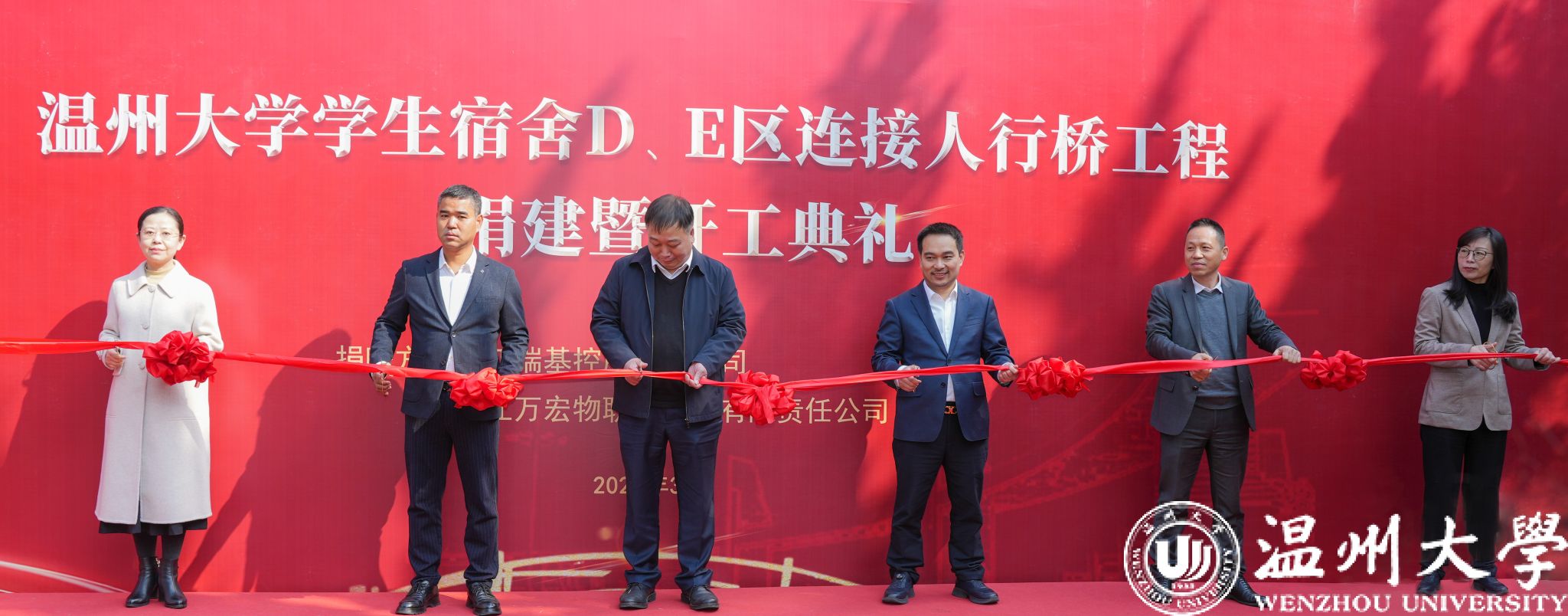 3月7日,日本a片 举行学生宿舍D、E区连接人行桥工程捐建暨开工典礼。校长赵敏,副校长王舜,副校长刘玉侠,党委委员、宣传部部长、统战部部长吴静,项目捐建方浙江瑞基控股有限公司董事长任国勇,浙江万宏物联网科技有限责任公司董事长郑建龙出席活动。