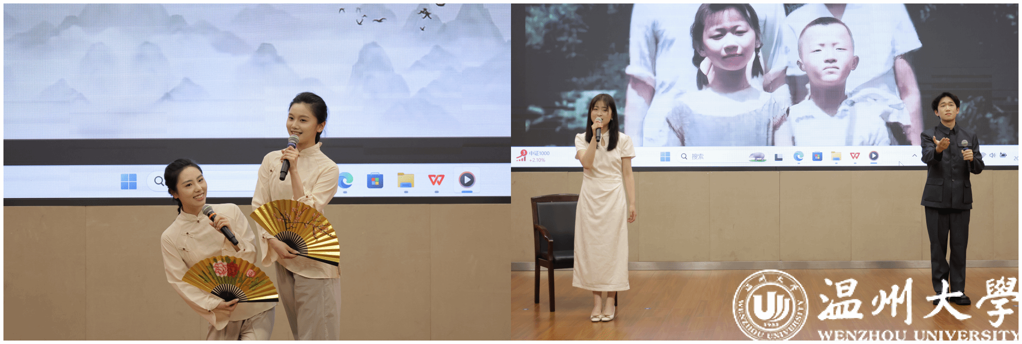 在经典诵读赛道上,参赛者们各展风采,凭借扎实的文学功底和精湛的朗诵技巧诠释经典。教育学院的潘奕瑶与钱炫合在作品《等待》中,深情诉说了邓稼先与许鹿希跨越二十八年的守望,这是个人情感的史诗,更是民族精神的缩影;人文学院曹光豪、彭帅、丁熠冬、叶佳诚的作品《月光下的中国》以诗性笔触织就山河入梦的磅礴画卷;唐佳楠、张雅诗、唐森浩、石嵩言则用《诗意中国》传递文化血脉中的浪漫情怀。他们或激情澎湃,或深沉婉转,起伏停顿间精准地把握着节奏韵律,赢得台下观众阵阵掌声。