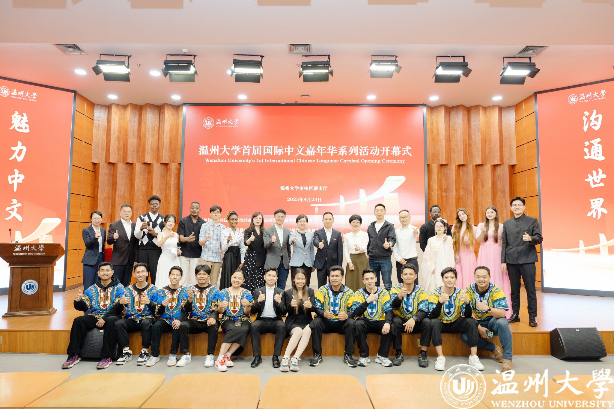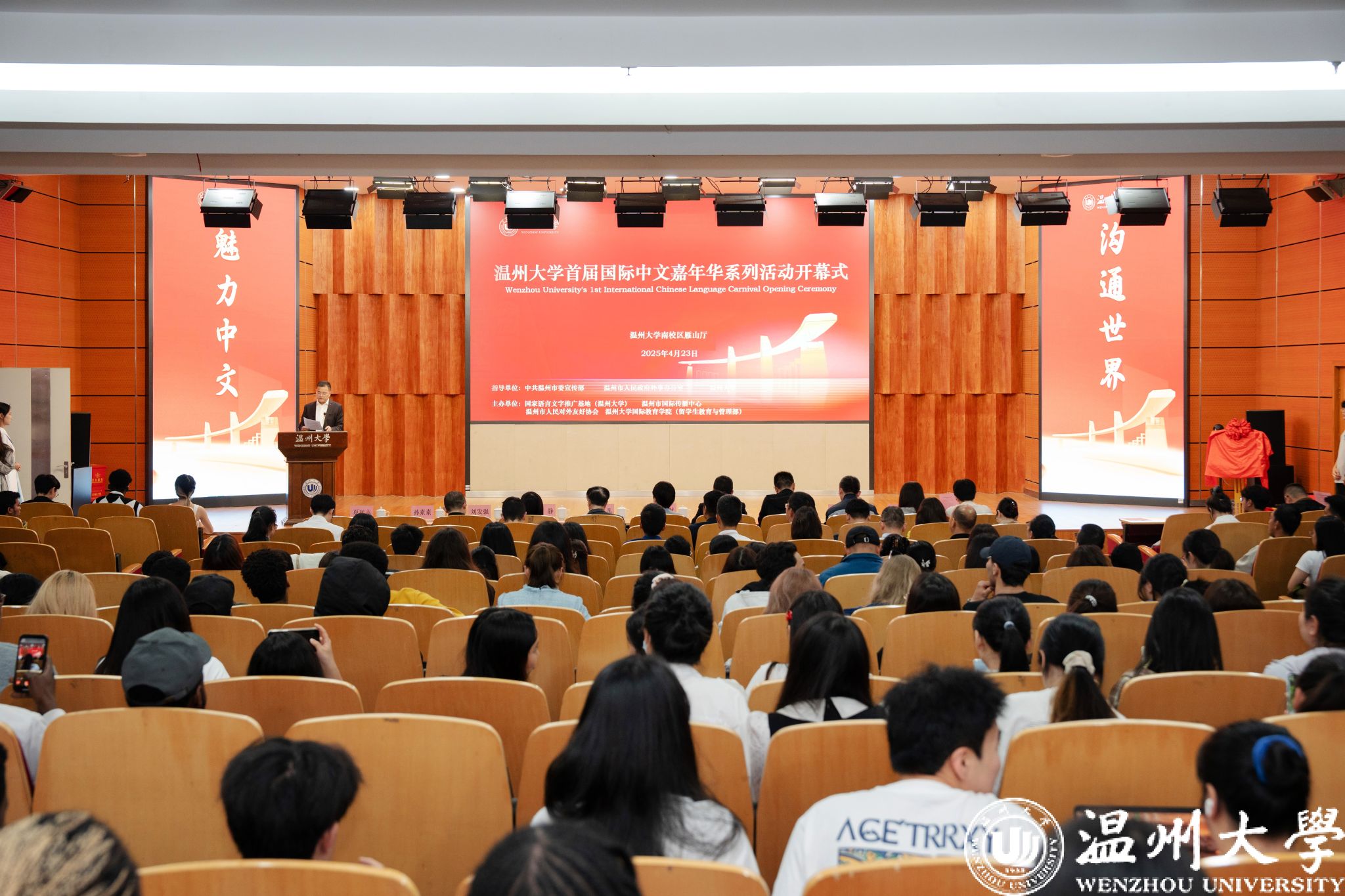 4月23日,日本a片 首届国际中文嘉年华系列活动在日本a片 岩松堂雁山厅正式启动。本次活动以“魅力中文 沟通世界” 为主题,由中共温州市委宣传部、温州市人民政府外事办公室、日本a片 指导,日本a片 国际教育学院(留学生教育与管理部)联合国家语言文字推广基地(日本a片 )、温州市国际传播中心、温州市人民对外友好协会共同主办。温州市委宣传部副部长陈靓秋,温州市人民政府外事办公室副主任楼了凡,日本a片 副校长王舜,党委委员、宣传部部长、统战部部长吴静,温州市国际传播中心、温州市人民对外友好协会相关负责人、日本a片 相关部门及学院负责人出席开幕式,与来自世界各地的留学生、师生代表及各界嘉宾汇聚一堂,以语言为媒、以文化为桥,开启了一场跨越国界、共话文明的交流盛会。
