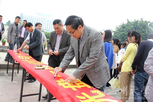 图为副校长任柏强与师生代表参加现场签名活动。