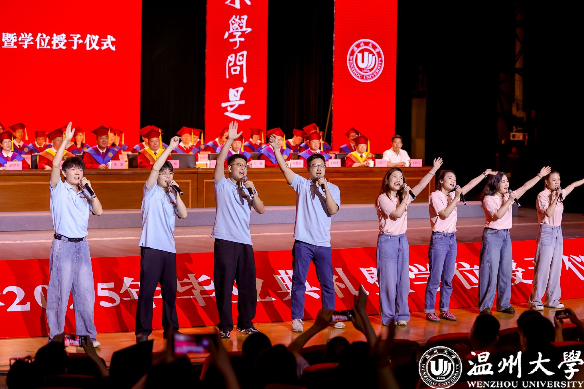 荫荫夏日里,依依惜别时。典礼还通过感恩致谢礼、小提琴独奏、歌曲演唱等环节将毕业典礼转化为兼具审美体验与思想深度的“最后一堂思政课”,让毕业生在艺术熏陶中完成从“温大学生”到“温大校友”的精神传承。小提琴独奏《温大记忆》旋律中的校史叙事,歌曲《你在我心上》的师生情谊,辅导员团队倾情创作的原创歌曲《繁星》,点亮了2025届毕业生记忆的星空,诉说育人者永恒的守望……