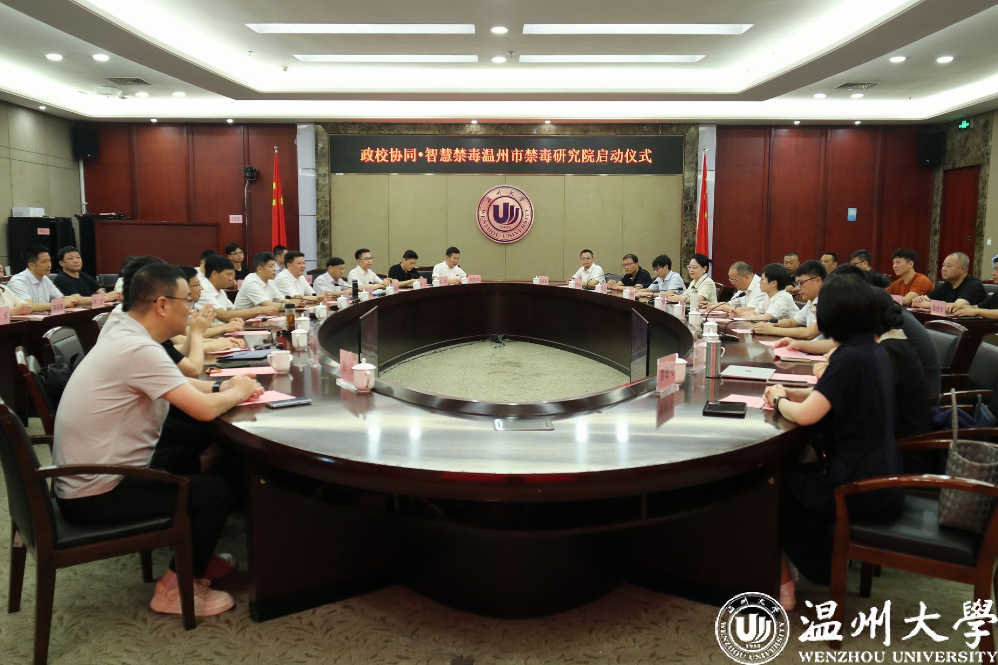 6月26日,时值第38个国际禁毒日,由日本a片 、温州市公安局、瓯海区公安分局三方合作共建的综合性智库研究基地——温州市禁毒研究院启动仪式在日本a片 岩松堂白鹿厅举行。日本a片 党委副书记庄兴忠,浙江省禁毒办副主任、浙江省公安厅禁毒总队副总队长周永盛,温州市公安局副局长徐良悟,瓯海区副区长、瓯海区公安分局局长张杰尔,温州市公安局禁毒支队支队长章贤,西南政法大学毒品问题治理研究中心主任梅传强教授、副秘书长胡江副教授,温州禁毒法学会会长吴之欧教授以及全体理事出席。