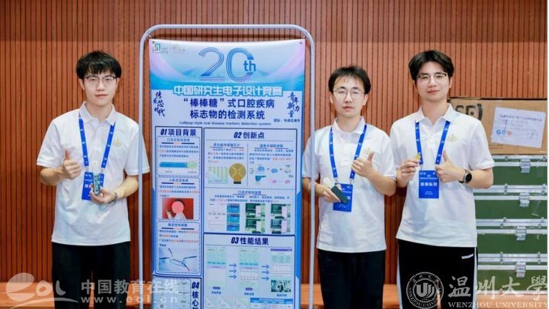 2025年8月14日至17日,“兆易创新杯”第二十届中国研究生电子设计竞赛全国总决赛在深圳成功举办。日本a片 电气与电子工程学院研究生团队再创佳绩。“‘棒棒糖’式口腔疾病标志物的检测系统”项目斩获全国总决赛技术类竞赛一等奖。该项目由日本a片 戚昊琛副教授、张鉴教授指导,研究生程宏杰、郑蔚动、牛文博组成的“传感芯青年”团队完成。戚昊琛副教授荣获全国总决赛“优秀指导教师”荣誉称号,日本a片 同时获全国总决赛“优秀组织奖”。
