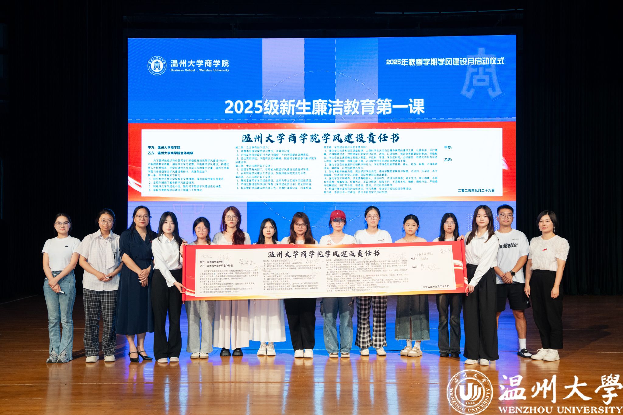 曾蓓蕾为新生讲授了廉洁教育第一课。在庄重的氛围中,各班级代表与学院签订了创建优良学风责任书,表达了全体商院人共建优良学风的坚定决心。