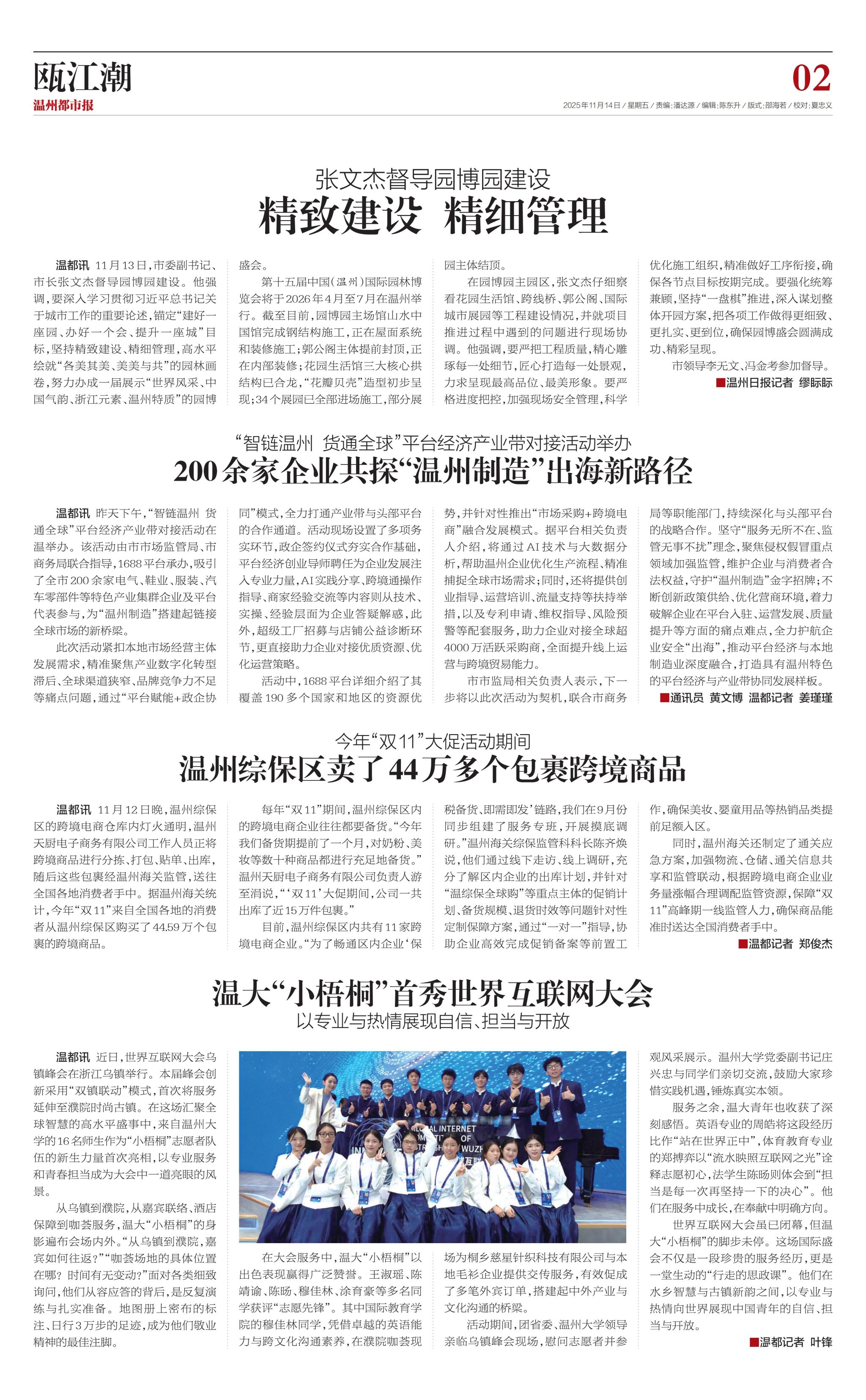 世界互联网大会虽已闭幕,但温大“小梧桐”的脚步未停。这场国际盛会不仅是一段珍贵的服务经历,更是一堂生动的“行走的思政课”。他们在水乡智慧与古镇新韵之间,以专业与热情向世界展现中国青年的自信、担当与开放。