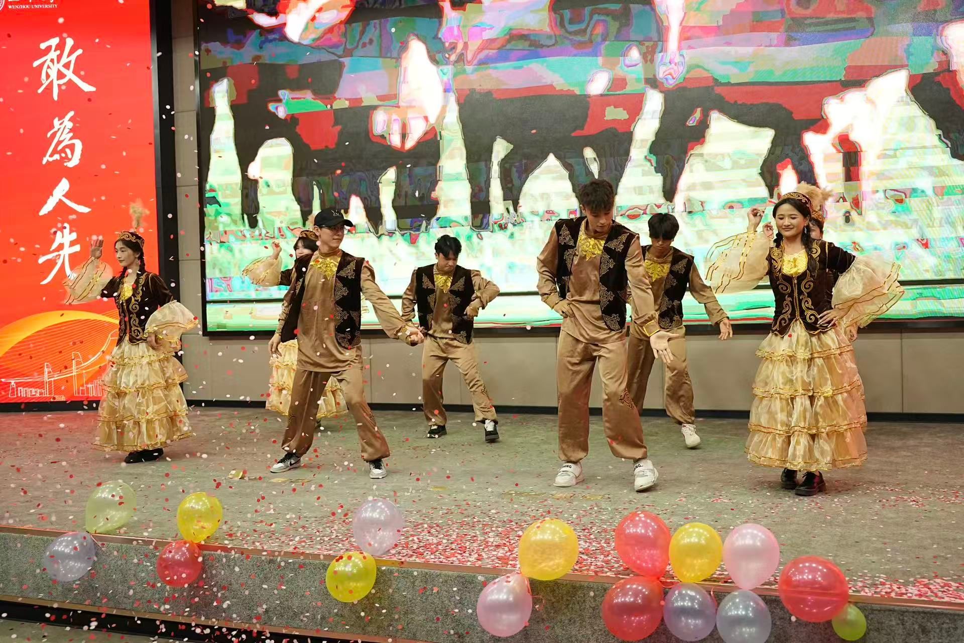 现场的迎新献礼环节温情满满。学校为今年入学的少数民族学生赠送惊喜礼包,新生代表则向老师们敬献象征敬意与祝福的洁白哈达,传递尊师重道与民族情谊。民族风情文艺汇演更是异彩纷呈,藏族舞《首饰》轻盈典雅,新疆舞串烧热烈奔放,歌曲《在那东山顶上》空灵动人,藏族群舞《授权》、哈萨克族舞《黑走马》等节目赢得热烈的欢呼与掌声……中场穿插的民族知识趣味抢答环节更是“以乐传学”,让师生在轻松愉快的氛围中学习民族文化知识,加深对多元一体中华文化的理解与认同。
