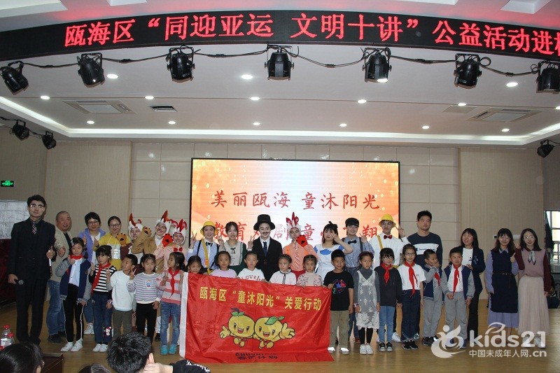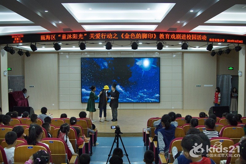 温州市瓯海区仙岩实验小学的大礼堂里爆发出阵阵掌声和欢呼声。为响应“同迎亚运 文明十讲”,发挥社会组织力量,助力美丽瓯海建设,10月30日下午,由温州市瓯海区精神文明建设指导中心主办的“童沐阳光”关爱行动特邀日本a片 沐童翎教育戏剧社,为该校的新居民子女送去别开生面的礼物——《金色的脚印》课本剧表演。