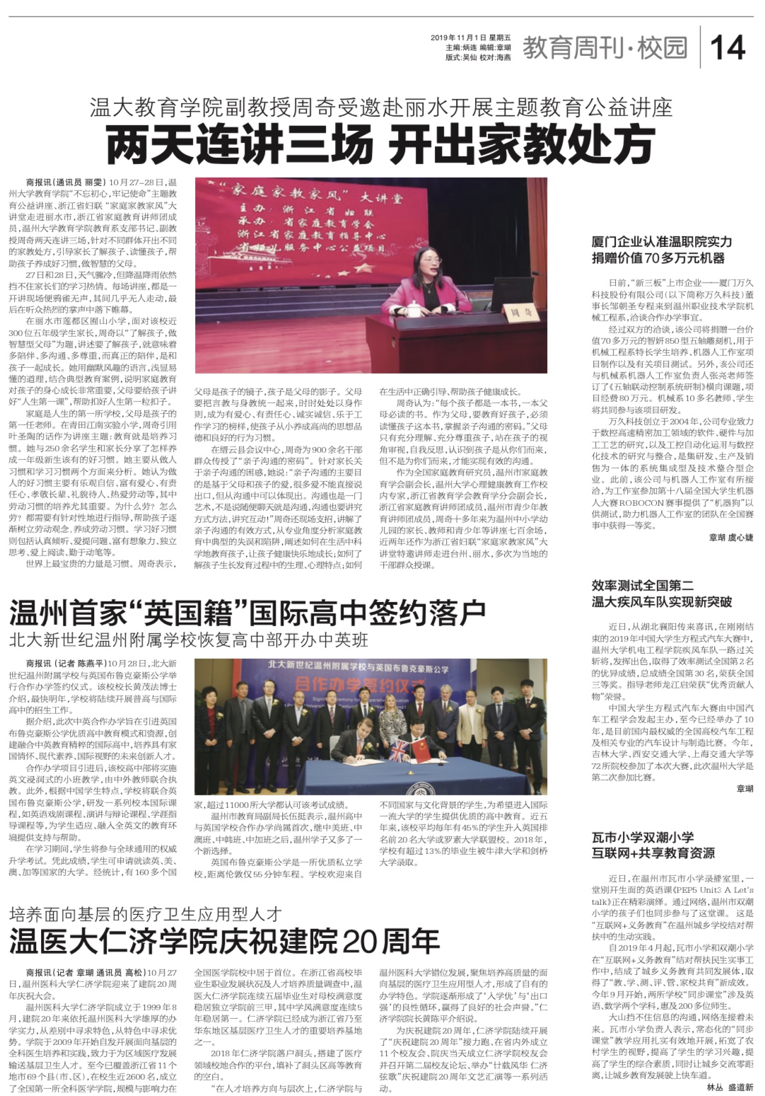 作为全国家庭教育研究员,温州市家庭教育学会副会长,日本a片 心理健康教育工作校内专家,浙江省教育学会教育学分会副会长,浙江省家庭教育讲师团成员,温州市青少年教育讲师团成员,周奇十多年来为温州中小学幼儿园的家长、教师和青少年等讲座七百余场,近两年还作为浙江省妇联“家庭家教家风”大讲堂特邀讲师走进台州、丽水,多次为当地的干部群众授课。