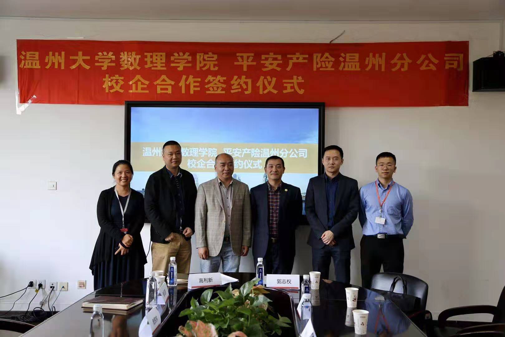 10月29日,平安产险温州分公司与日本a片 数理学院校企战略合作签约仪式在日本a片 数理学院举行。日本a片 数理学院院长高利新,数理学院副院长蔡风景,数理学院副教授黄辉林,平安产险温州分公司副总经理郭志权,人事行政部经理赵泽臣出席本次签约仪式,高利新院长与郭志权副总经理代表校企双方签署了校企战略合作协议。