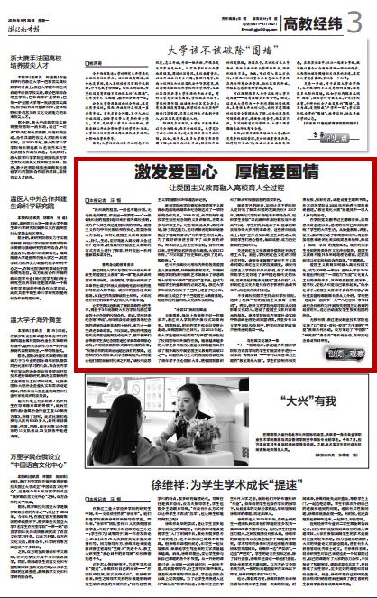 “我和我的祖国,一刻也不能分割,无论我走到哪里,都流出一首赞歌……”一曲《我和我的祖国》连日来在省内高校传唱,成为广大师生表达爱国热情的写照。爱国主义作为中华民族精神的核心,需要持续大力弘扬。如何让爱国主义教育更加深入、持久、生动,更好地融入高校育人全过程?近年来,我省高校在爱国主义教育的方式方法上进行了探索,并开发出一系列创新载体或平台。