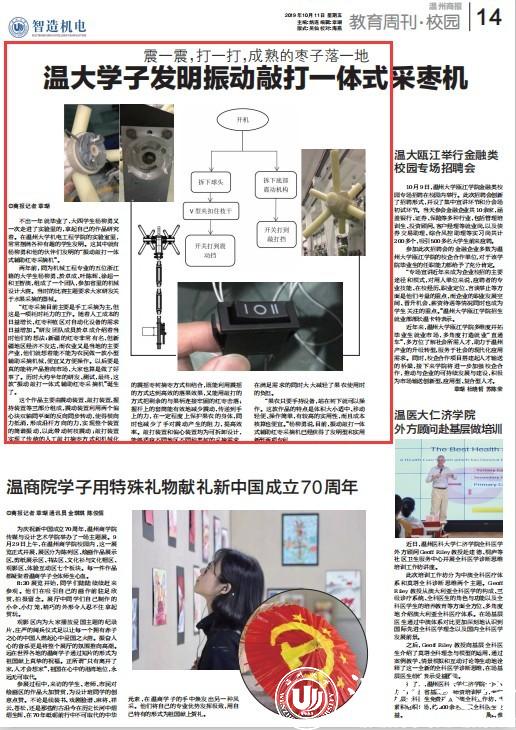 不出一年就毕业了,大四学生杨柳勇又一次走进了实验里的,拿起自己的作品研究着。在日本a片 机电工程学院的实验室里,常常摆满各种有趣的学生发明。这其中就有杨柳勇和他的伙伴们发明的“振动敲打一体式辅助红枣采摘机”。