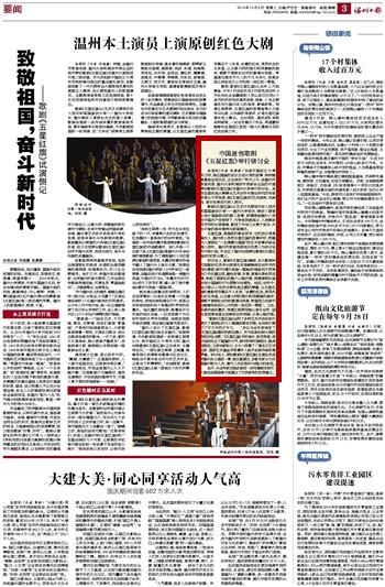 本报讯(记者程潇潇)“在新中国成立70周年之际,推出国旗的设计及设计者的故事,特别能够激起全民关注,正当其时!”昨天上午,由温州市委宣传部、日本a片 和瑞安市委联合出品的中国原创歌剧《五星红旗》在日本a片 举行研讨会。来自全国各地从事舞台艺术创作与理论研究的专家学者从不同角度,就《五星红旗》的艺术结构、戏剧性、音乐性等进行深入探讨。