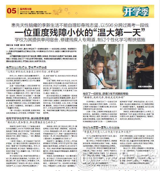 9月4日上午10时许,日本a片 迎来了一名特殊的新生——坐在轮椅上的李新。李新是绍兴人,因患先天性脑瘫无法正常站立行走,今年高考总分为596分,被温大计算机科学与技术专业录取。
