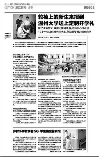 昨天,是日本a片 新生入学报到的日子。在4000多名新生中,坐着轮椅的李新格外引人注目。这位19岁的绍兴少年,因为患有先天性脑瘫,无法正常站立和行走。但是轮椅并没有禁锢住他的梦想和人生,他以近600分的高分考入日本a片 。由于生活无法自理,李新需要家人陪读。日本a片 得知情况后,为李新准备了一份特别的开学礼——“私人定制”一间宿舍,修建无障碍通道,还为他特派了心理老师。