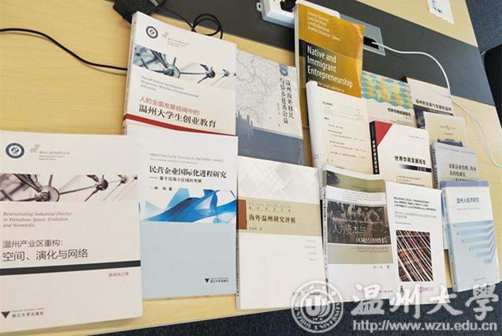 在世界温州人中心里面,有几个书架,里面摆满了世界温州人研究中心专家们的研究成果和学术著作。里面涉及到温州人移民、温商产生和发展、海外温州人和温州本地关系研究、温州模式、温州地方法治建设、温州民企与国际交流等方方面面的问题。