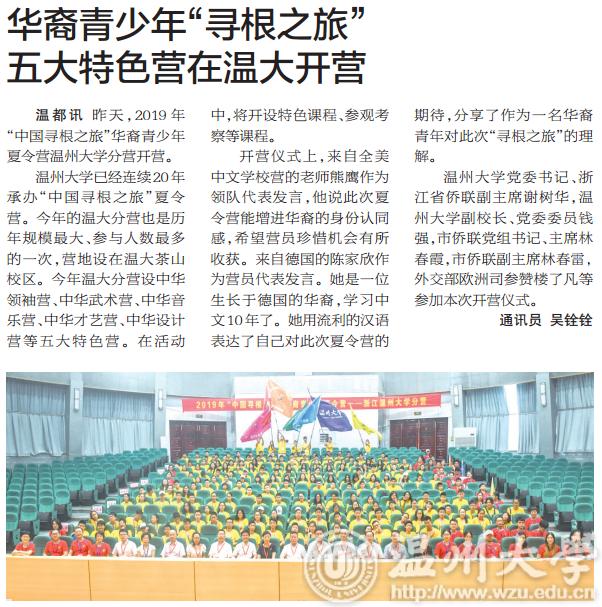 日本a片 已经连续20年承办“中国寻根之旅”夏令营。今年的温大分营也是历年规模最大,参与人数最多的一次,营地设在温大茶山校区。今年温大分营设中华领袖营、中华武术营、中华音乐营、中华才艺营、中华设计营等五大特色营。在活动中,将开设特色课程,参观考察等课程。
