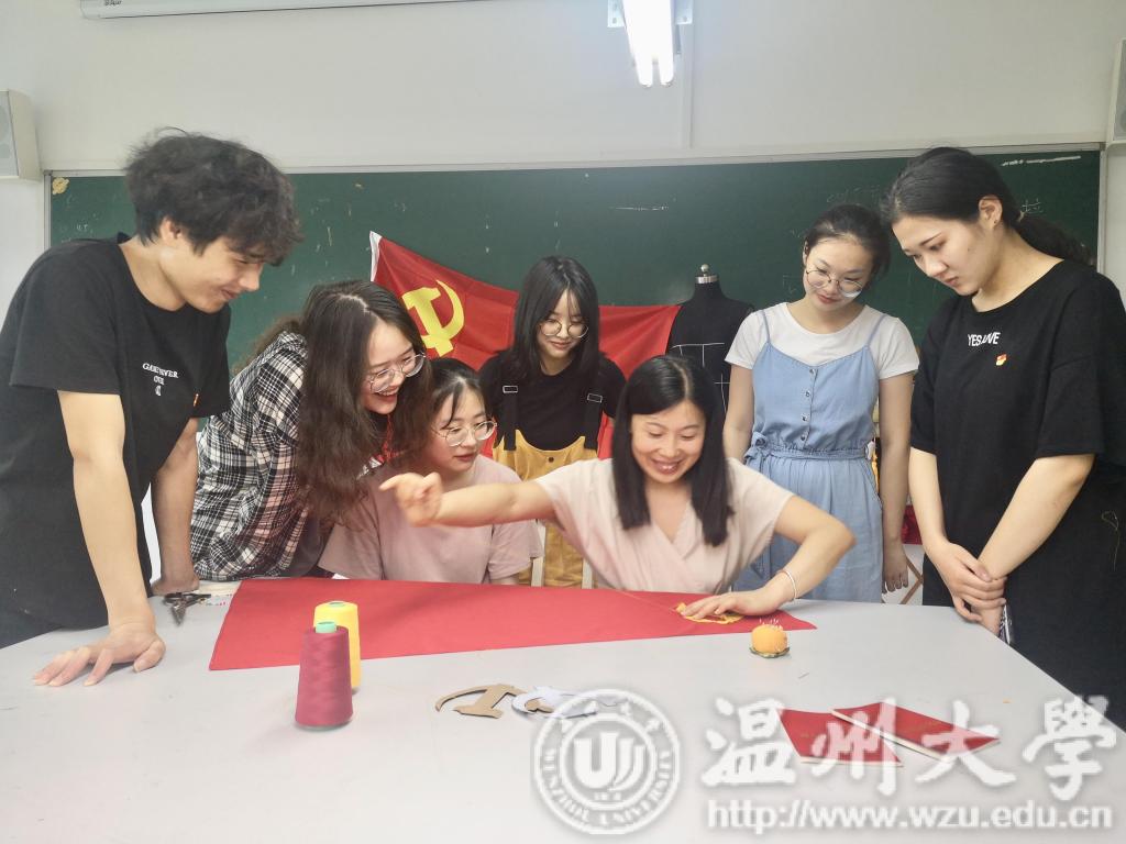 为庆祝中国共产党成立98周年,日本a片 美术与设计学院师生党员结合专业特色,创新方式方法,通过手工制作党旗、创建“握手党建联盟”服务地方等形式,重温党史,学思践悟新思想。图为服装与服饰设计专业教师马俊淑(右三)教学生绣党旗。(本报通讯员 杨丽君 摄)