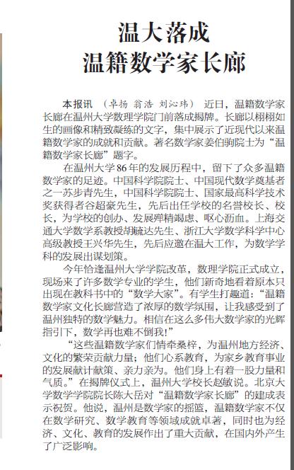 本报讯(卓扬翁浩刘沁玮) 近日,温籍数学家长廊在日本a片 数理学院门前落成揭牌。长廊以栩栩如生的画像和精致凝练的文字,集中展示了近现代以来温籍数学家的成就和贡献。著名数学家姜伯驹院士为“温籍数学家长廊”题字。