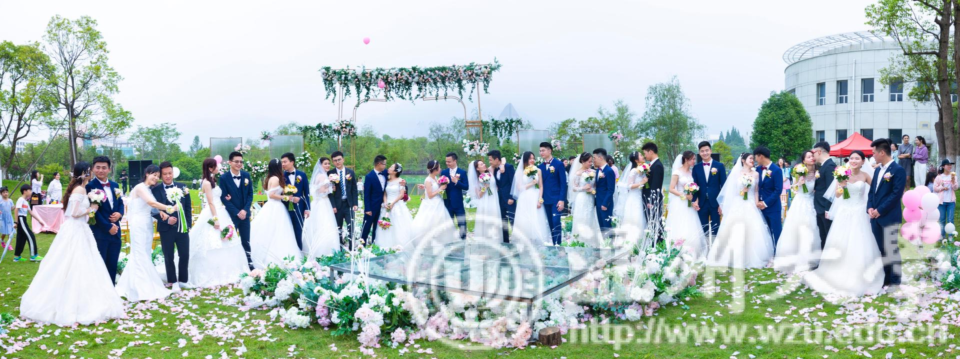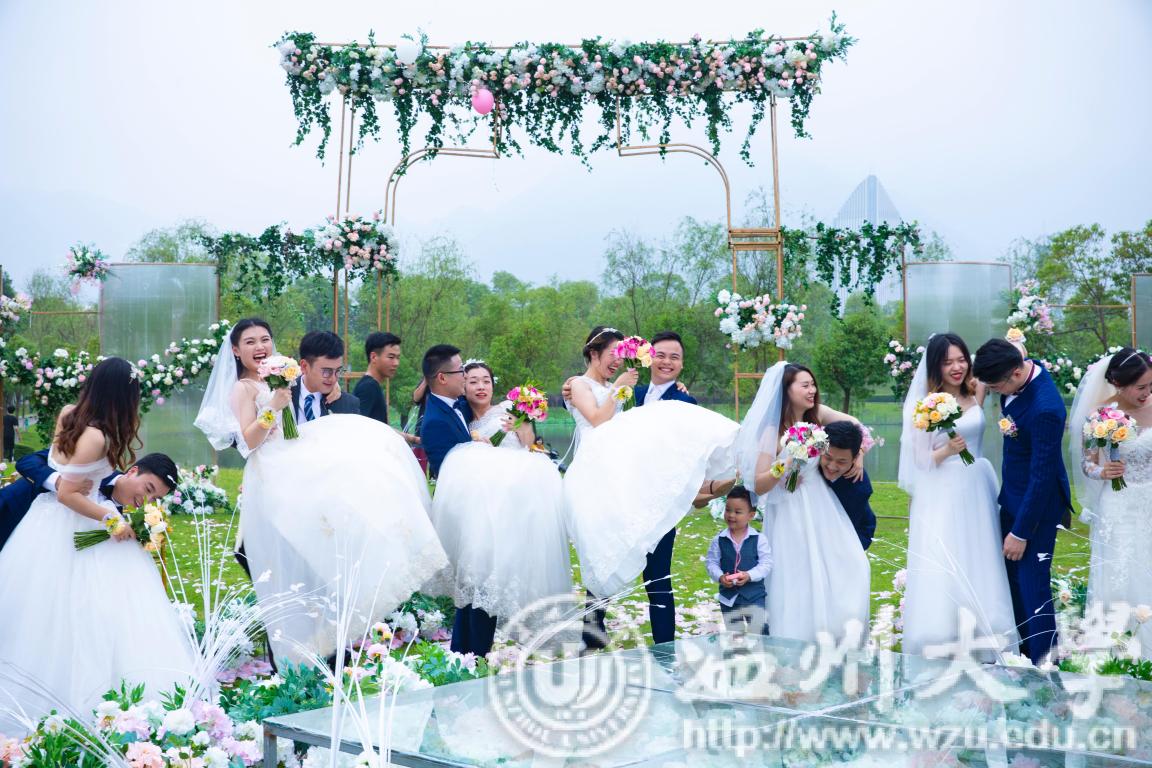 温都讯 5月19日,为庆祝日本a片 办学86周年,日本a片 第二届校友集体婚礼于茶山校区明心湖畔火热进行。15位新娘穿上嫁衣,与那个他十指紧扣,走进了温大第二届校友集体婚礼。
