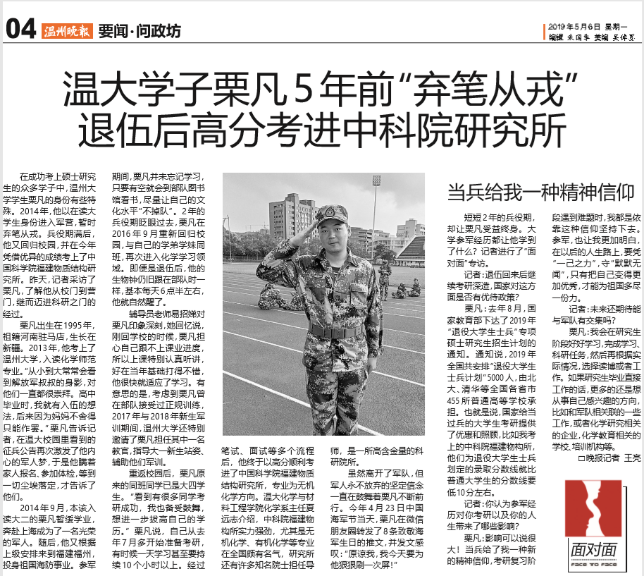 栗凡:去年8月,国家教育部下达了2019年“退役大学生士兵”专项硕士研究生招生计划的通知。通知说,2019年全国共安排“退役大学生士兵计划”5000人,由北大、清华等全国各省市455所普通高等学校承担。也就是说,国家给当过兵的大学生考研提供了优惠和照顾,比如我考上的中科院福建物构所,他们为退役大学生士兵划定的录取分数线就比普通大学生的分数线要低10分左右。