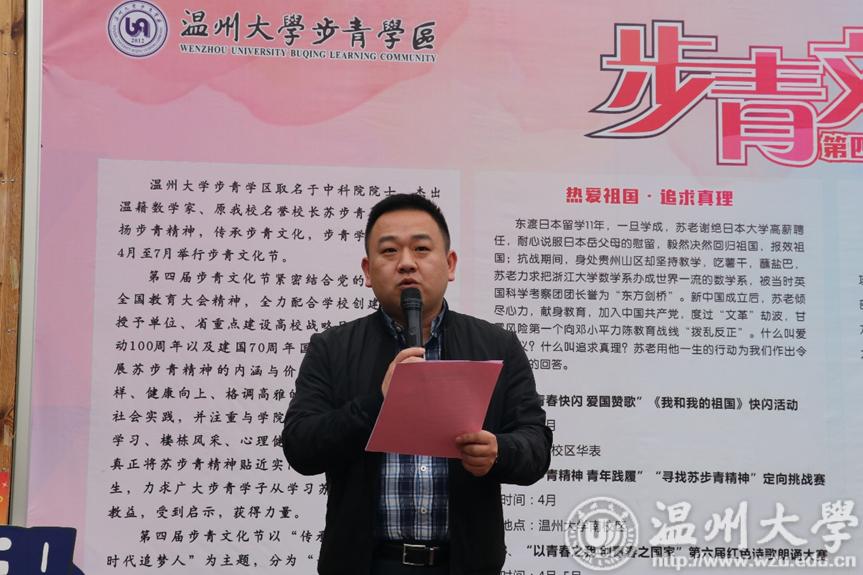 2019年4月10日,日本a片 步青学区第四届步青文化节开幕式暨首届“寻找苏步青精神”定向挑战赛在步青文化广场顺利举办,步青学区党委副书记张朝辉,综合办公室副主任杨鹏,党团建办公司副主任叶洁琼以及步青学区各科室辅导员老师出席本次会议,此外,步青团学以及定向挑战赛参与者共200与人参加此次活动。