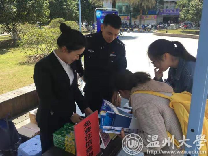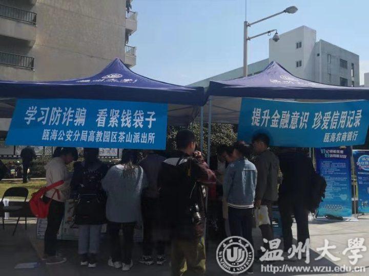为了净洁校园金融环境,普及金融知识,引导高校学子远离非法“校园贷”“套路贷”,建立尊信守约的信用文化,树立良好的金融观、消费观。3月15日,瓯海农商银行与日本a片 团委、保卫处、瓯海禁毒办、茶山派出所、茶山街道等单位在温大溯初学区共同举办“益·青春”:护航新时代大学生3·15主题广场活动。活动现场设置了大学生征信免费查询、防范“套路贷”宣传咨询、金融知识宣讲、金融诈骗、消费权益保护等20余个宣传摊位。